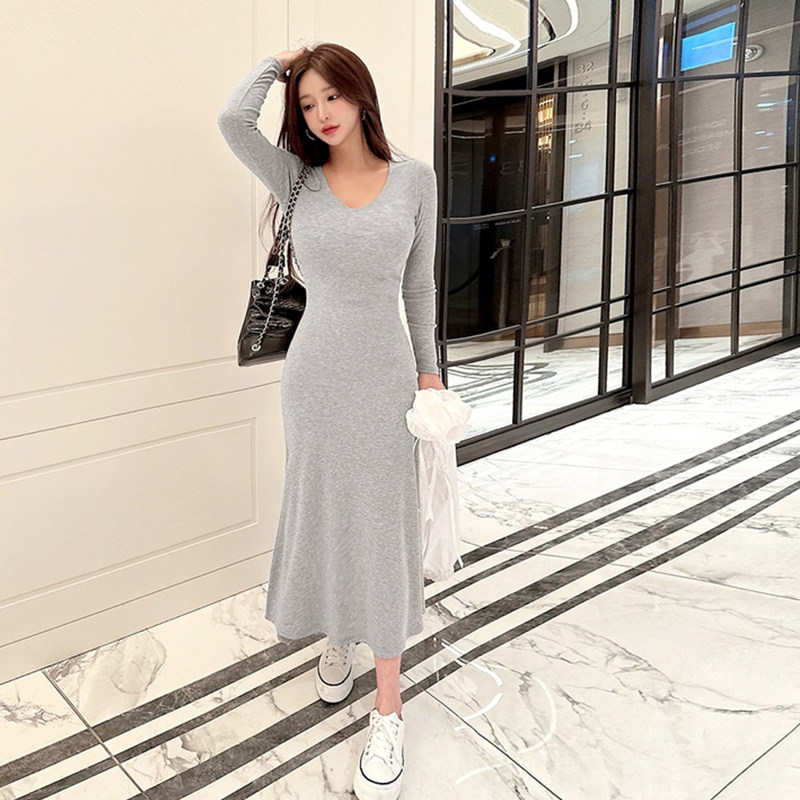 V领连衣裙女秋冬长袖包臀修身鱼尾长裙性感纯欲莫代尔垂坠感修身