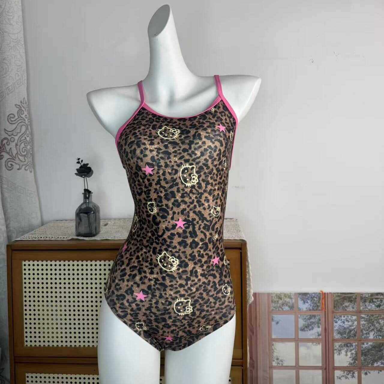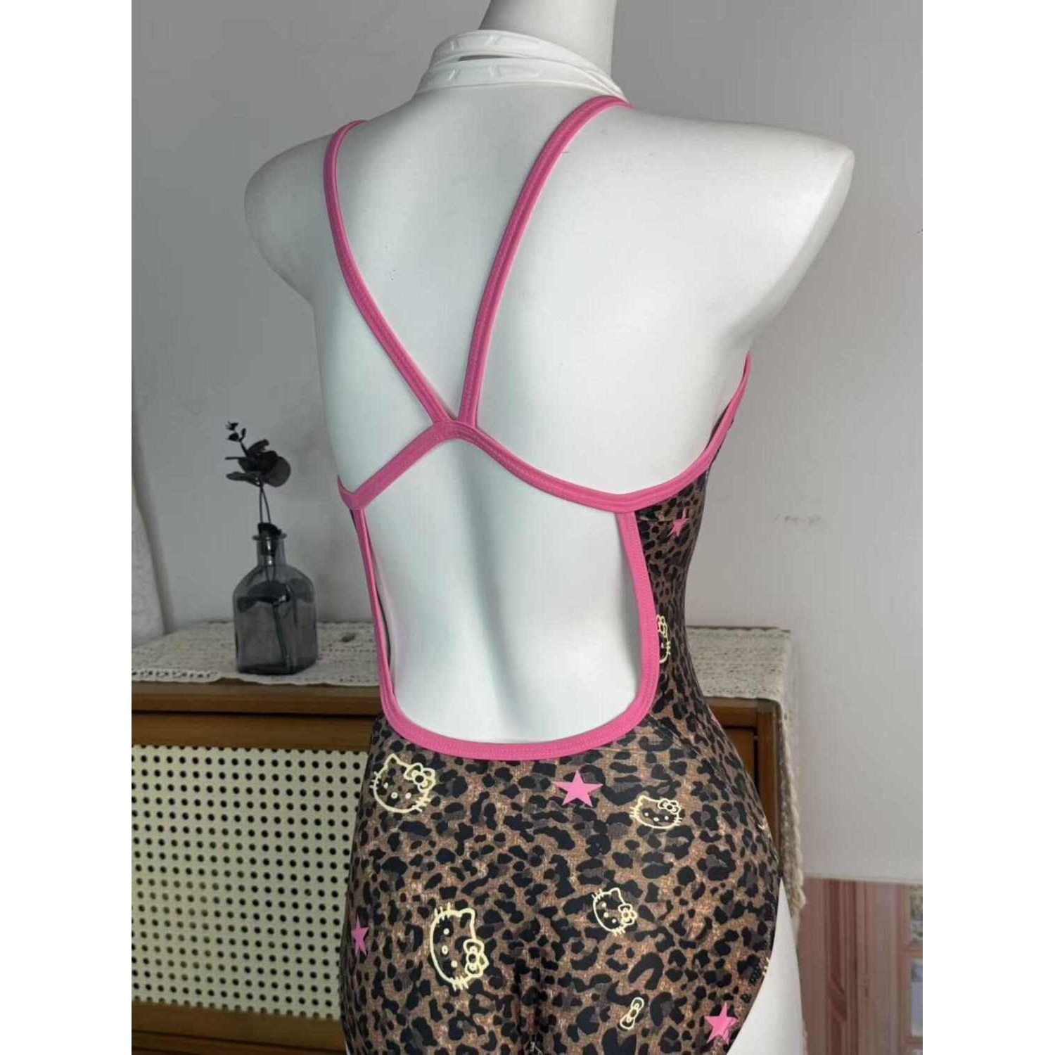新款高级感单层莱卡面料无胸垫连体三角竞速游泳衣女卡通豹纹KT