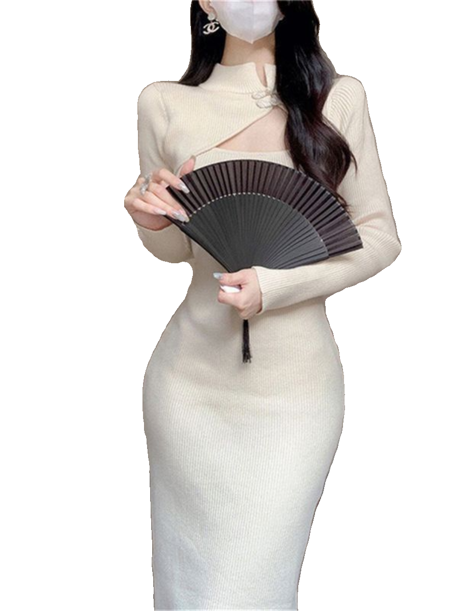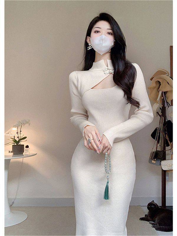配大衣内搭打底新中式改良旗袍白色针织连衣裙子女秋冬季2026新款