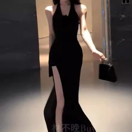 GirlsAt18 黑色高级V领连衣裙女2025女夏季新款性感开叉礼服长裙