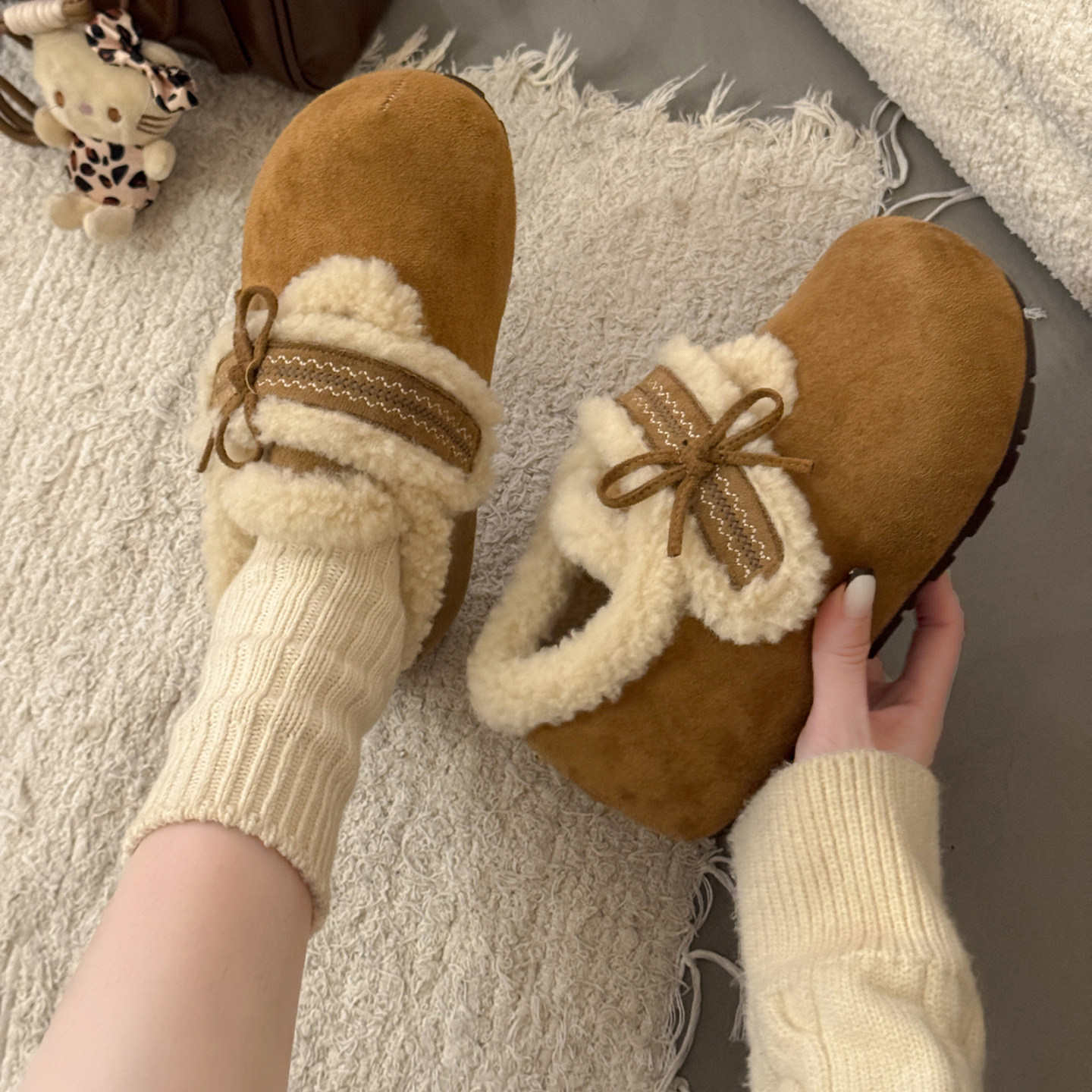 内增高厚底加绒勃肯棉鞋女2025新款冬季森系蝴蝶结保暖羊羔毛毛鞋
