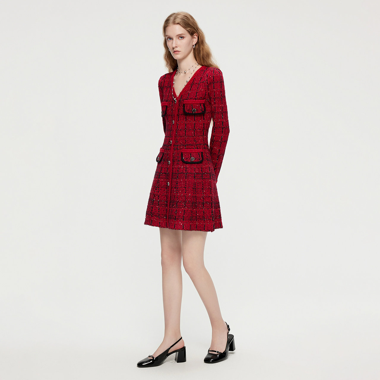 摩萨克冬季款格纹仿粗花呢小香风V领长袖短款针织连衣裙女