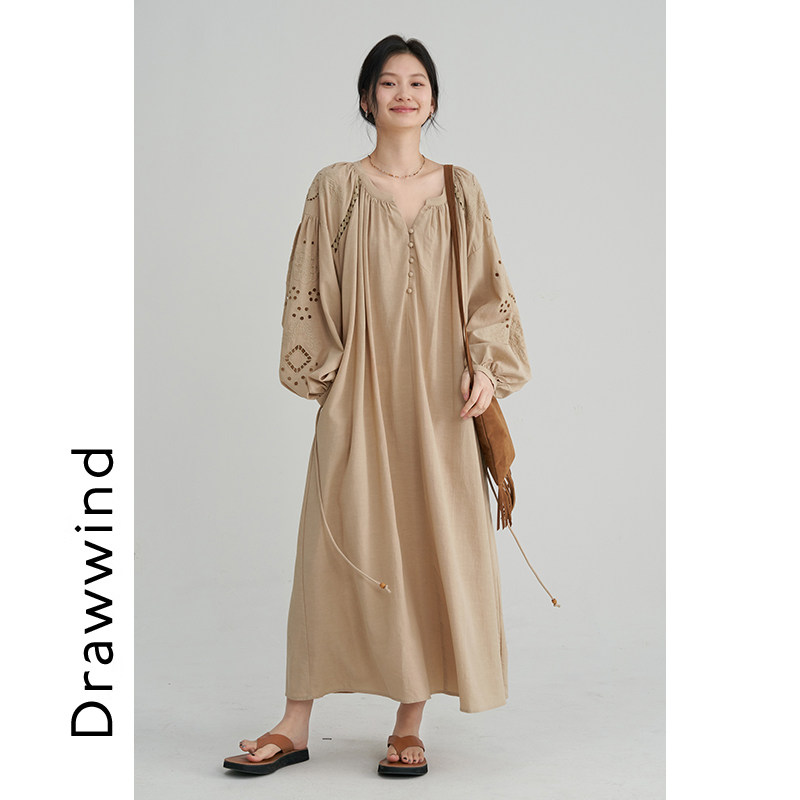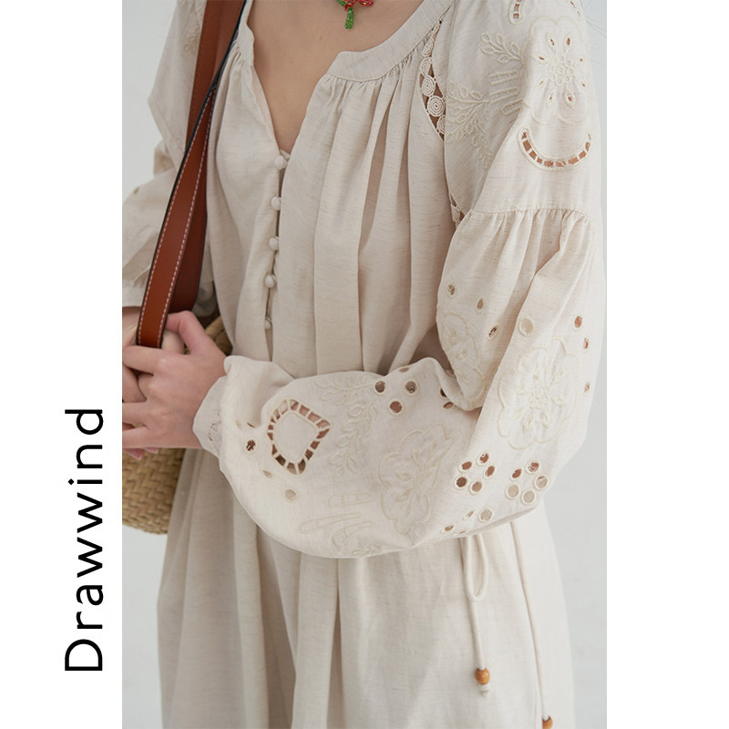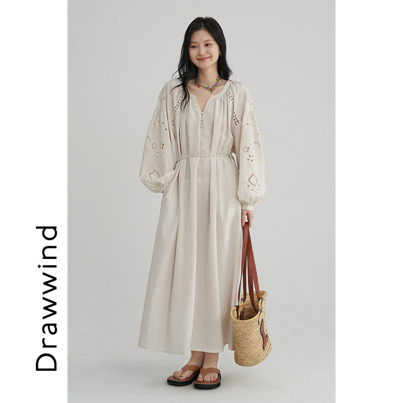 画风长袖法式V领连衣裙女新款春夏季宽松设计感绣花重工白色长裙