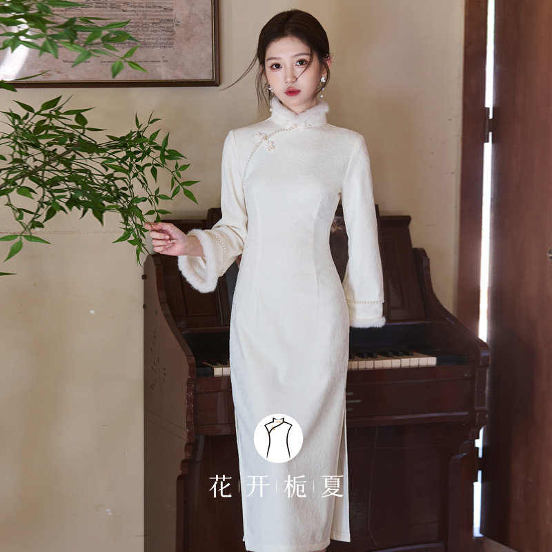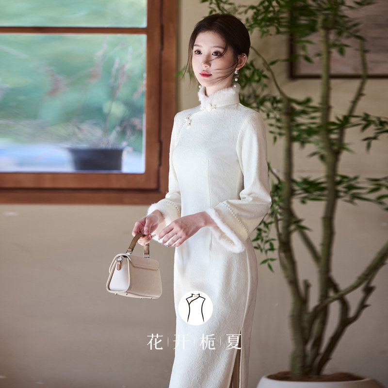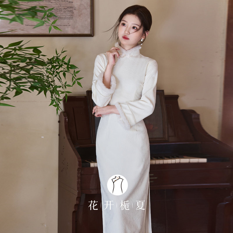 白色旗袍长袖加绒加厚2025冬季少女复古长款连衣裙领证登记11/14