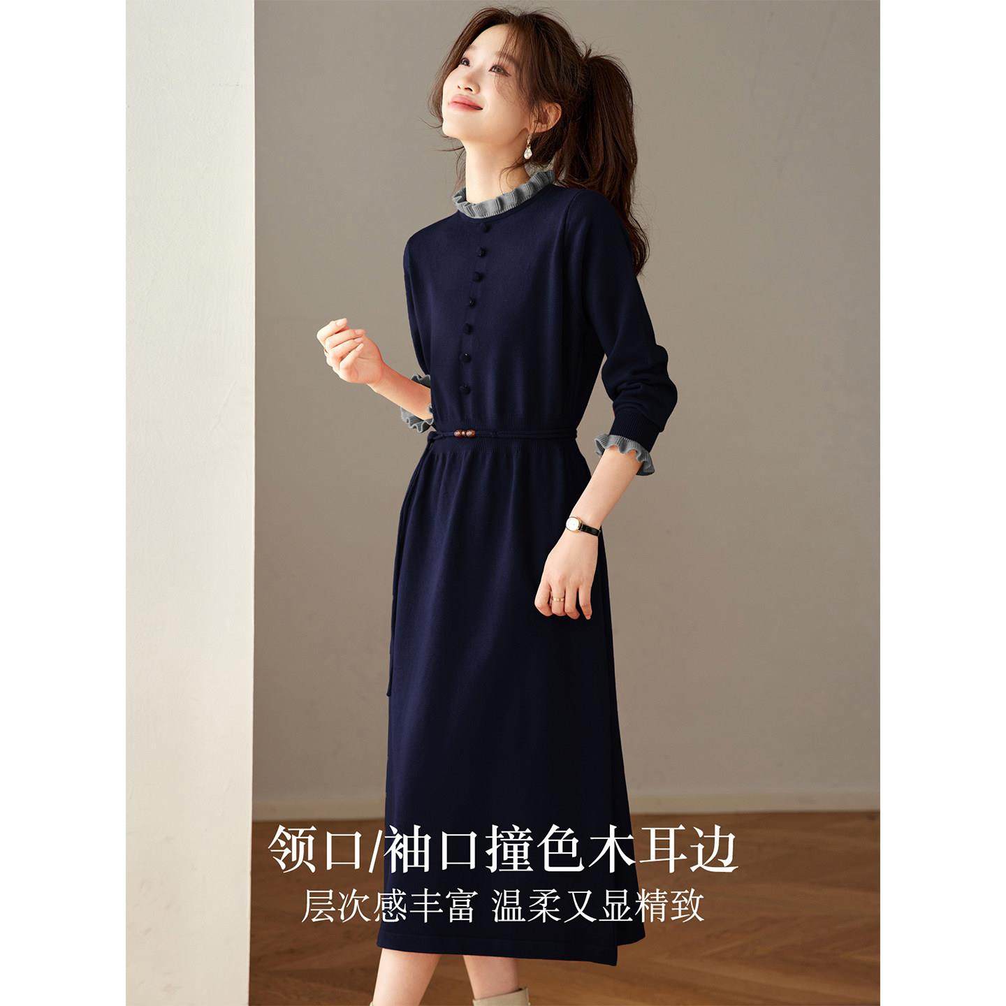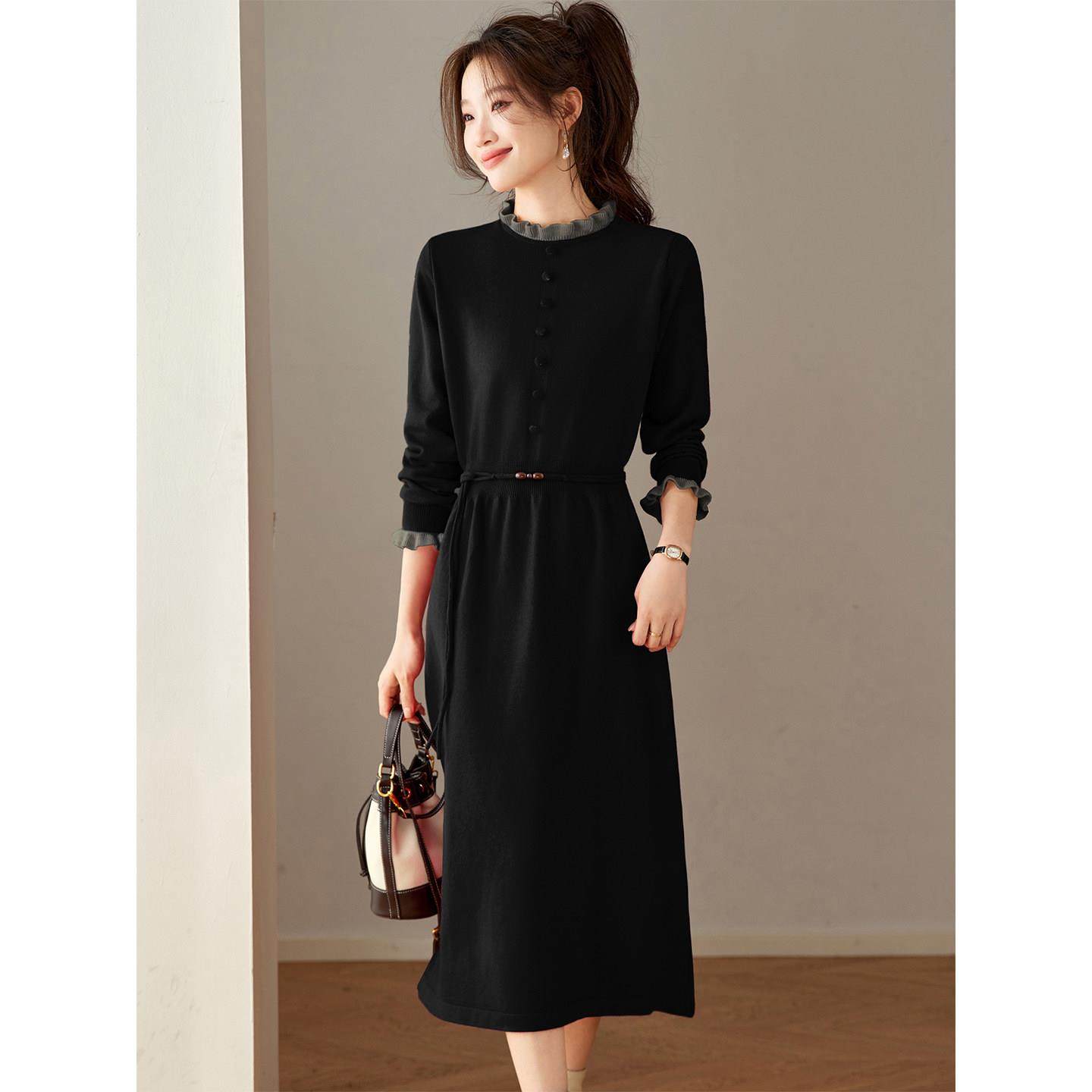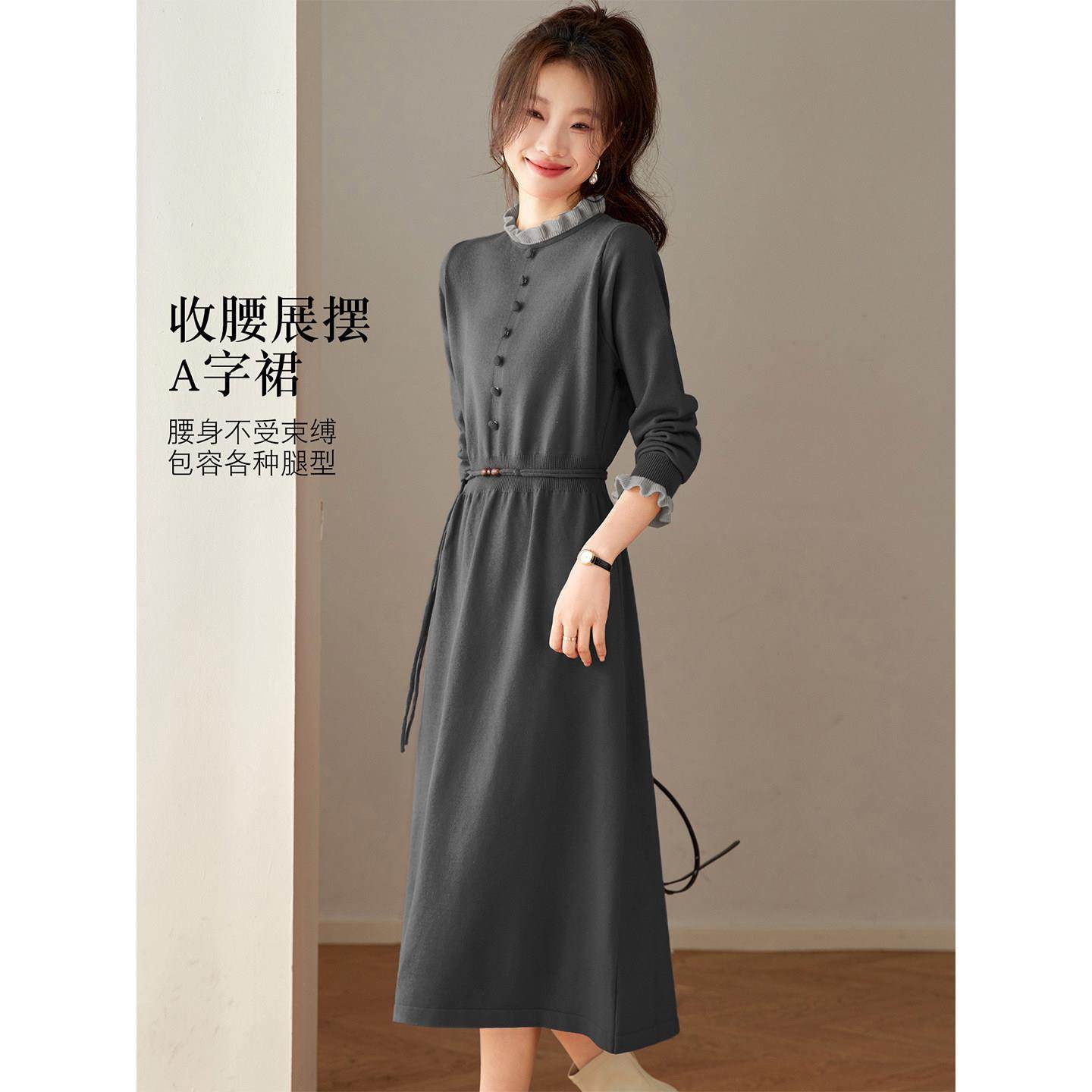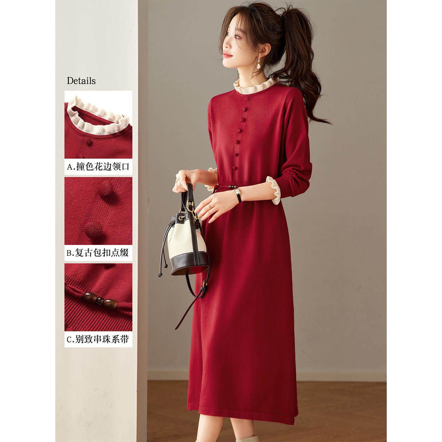 秋冬针织连衣裙女2025新款洋气红色收腰系带中长款气质显瘦打底裙