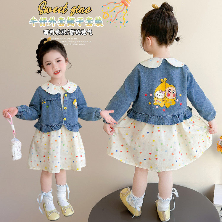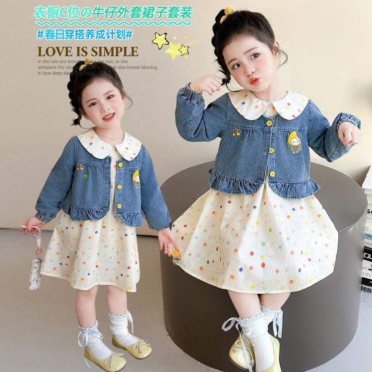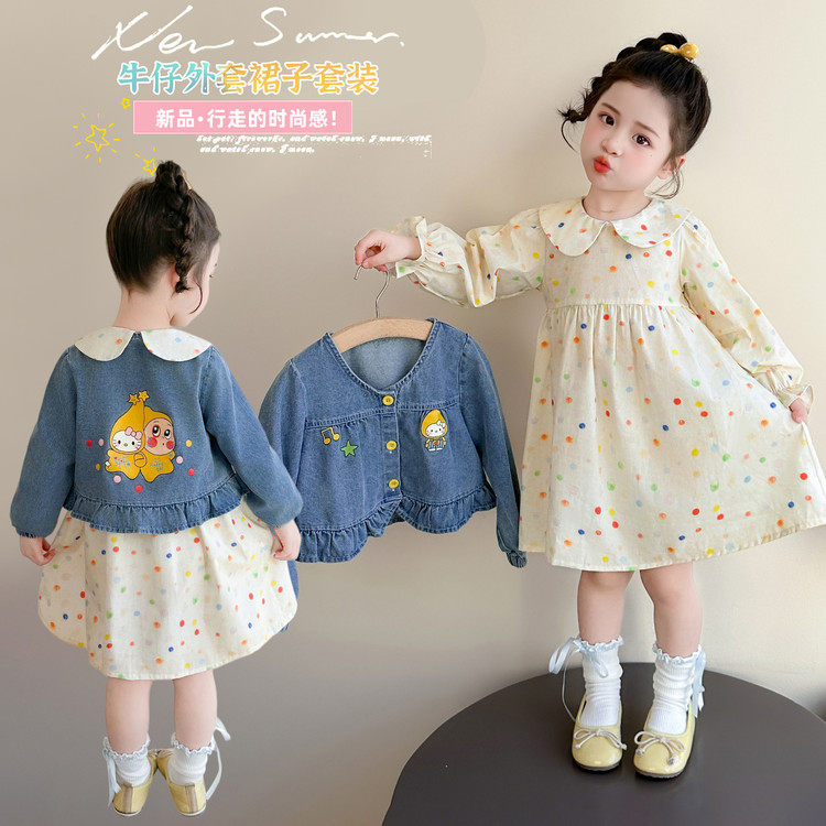长袖薄款女童春秋牛仔外套连衣裙套装娃娃领波点公主裙两件套洋气
