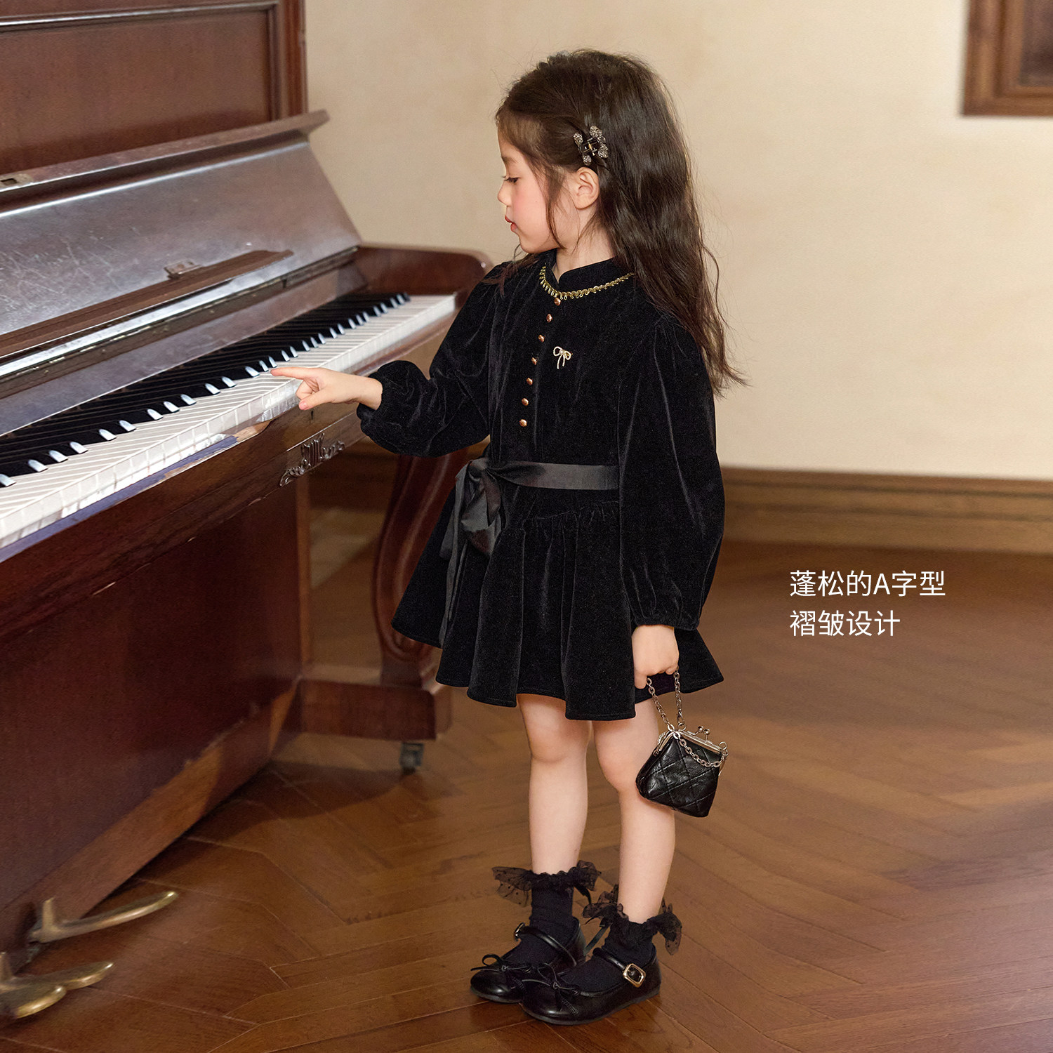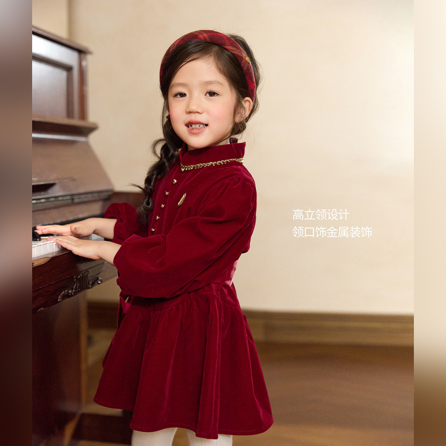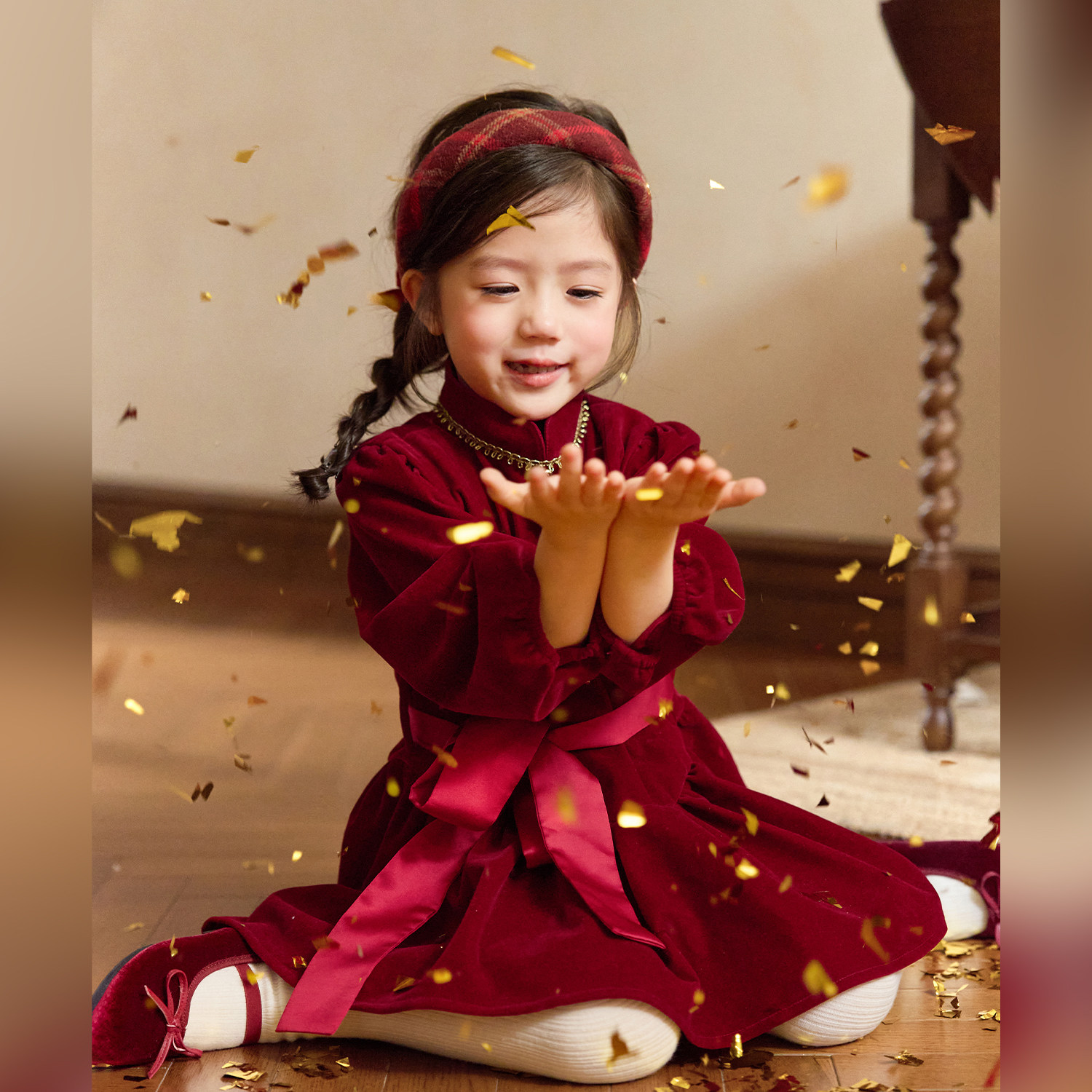 小O宝童装 宝宝丝绒红色连衣裙女2026新款女童新年礼服周岁公主裙