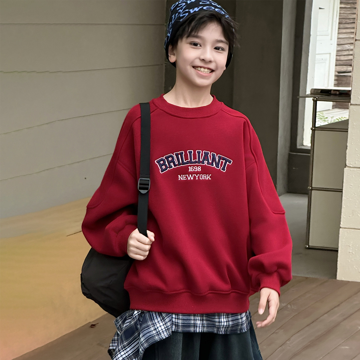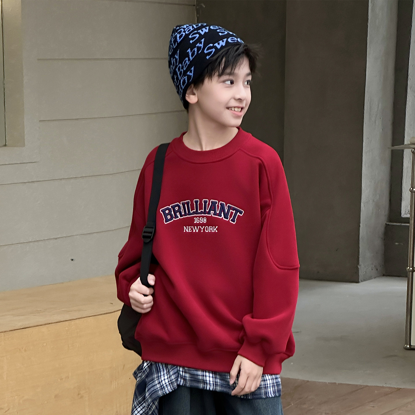 男童冬季新年红色本命年加绒卫衣2026新款青少年儿童新年加厚上衣