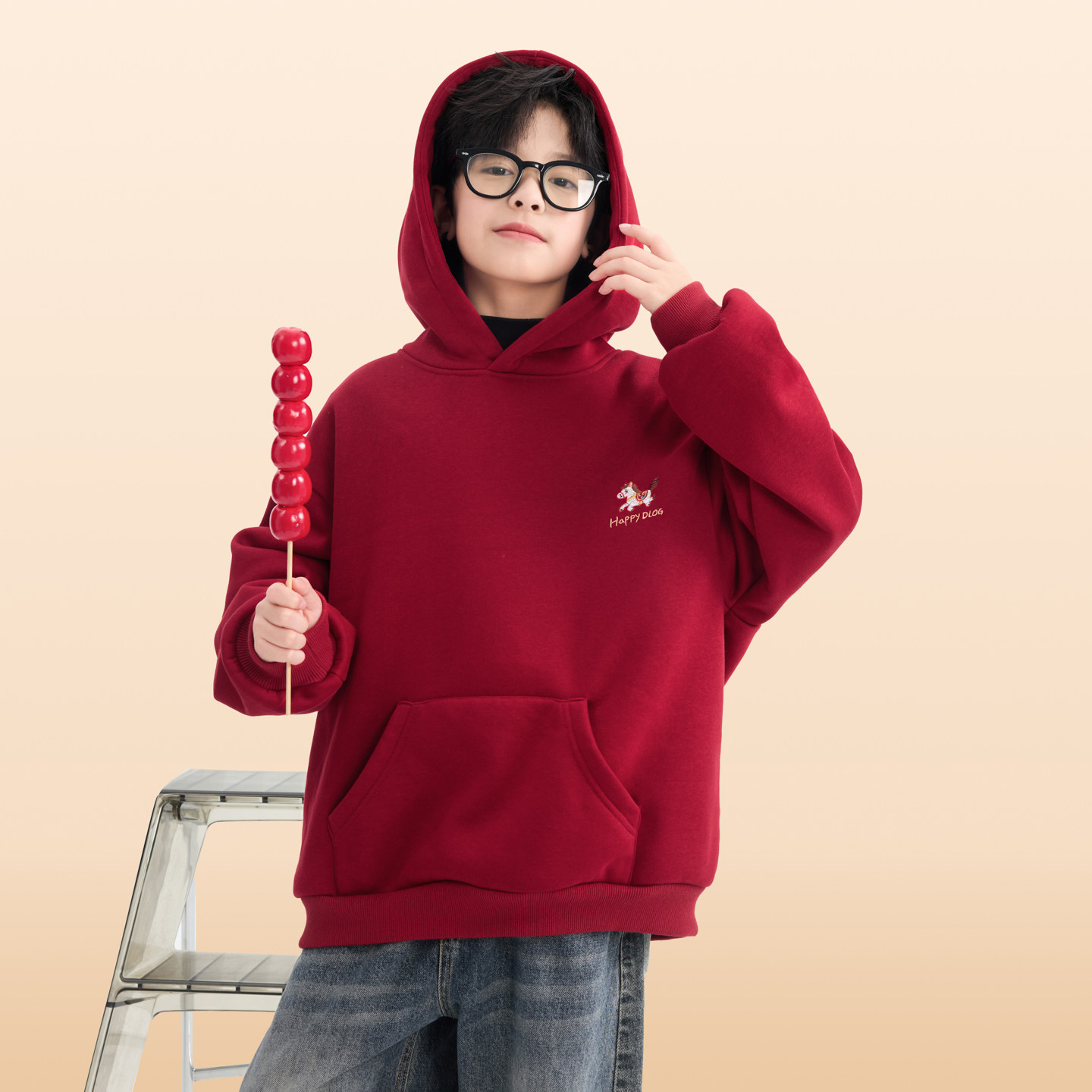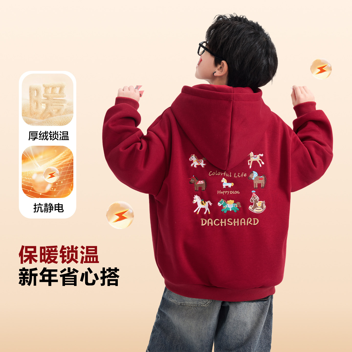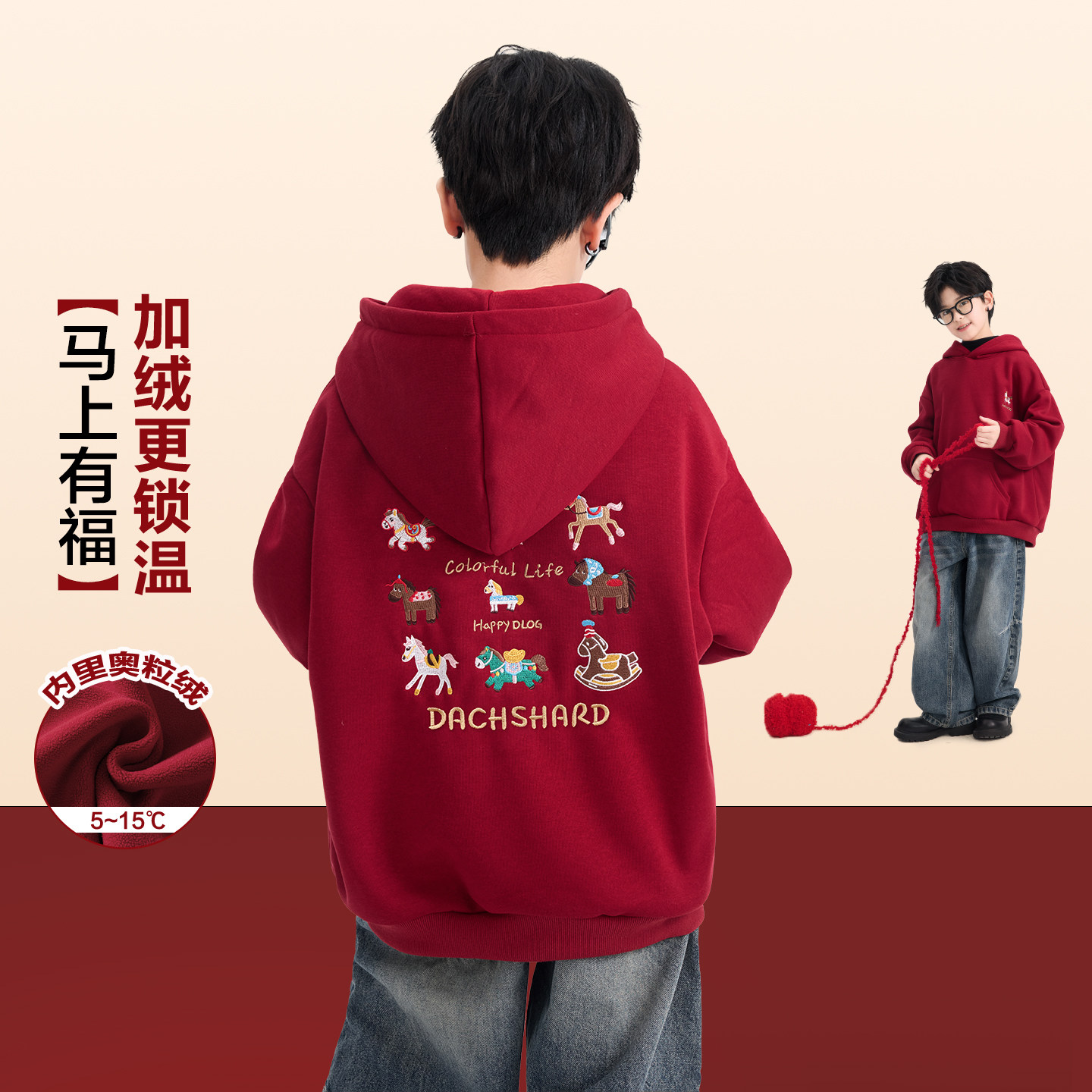 男童冬季本命年红色加绒连帽卫衣2026新款青少年儿童马年加厚上衣