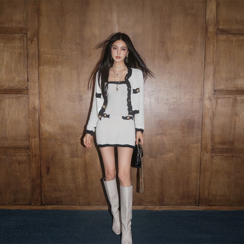 【现货】OLIVIA DUO小香风撞色肌理针织连衣裙长袖针织开衫两件套