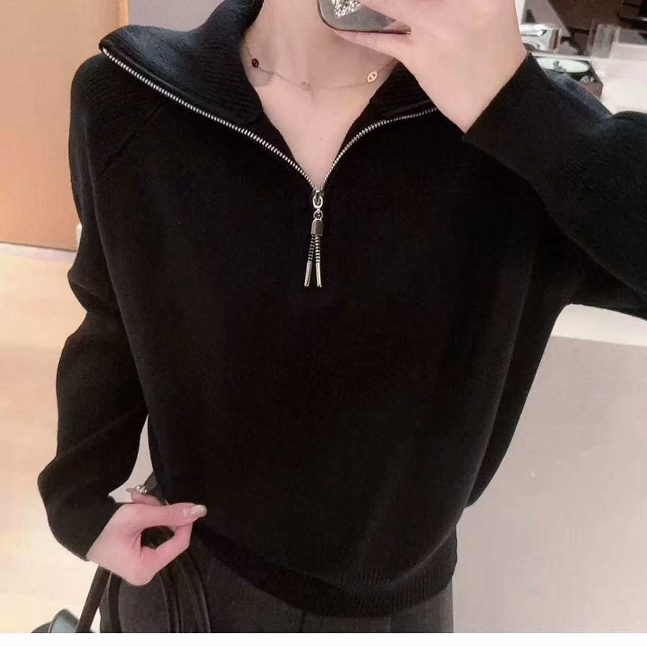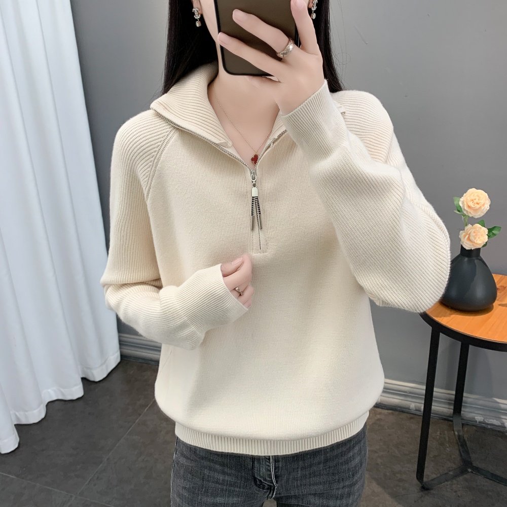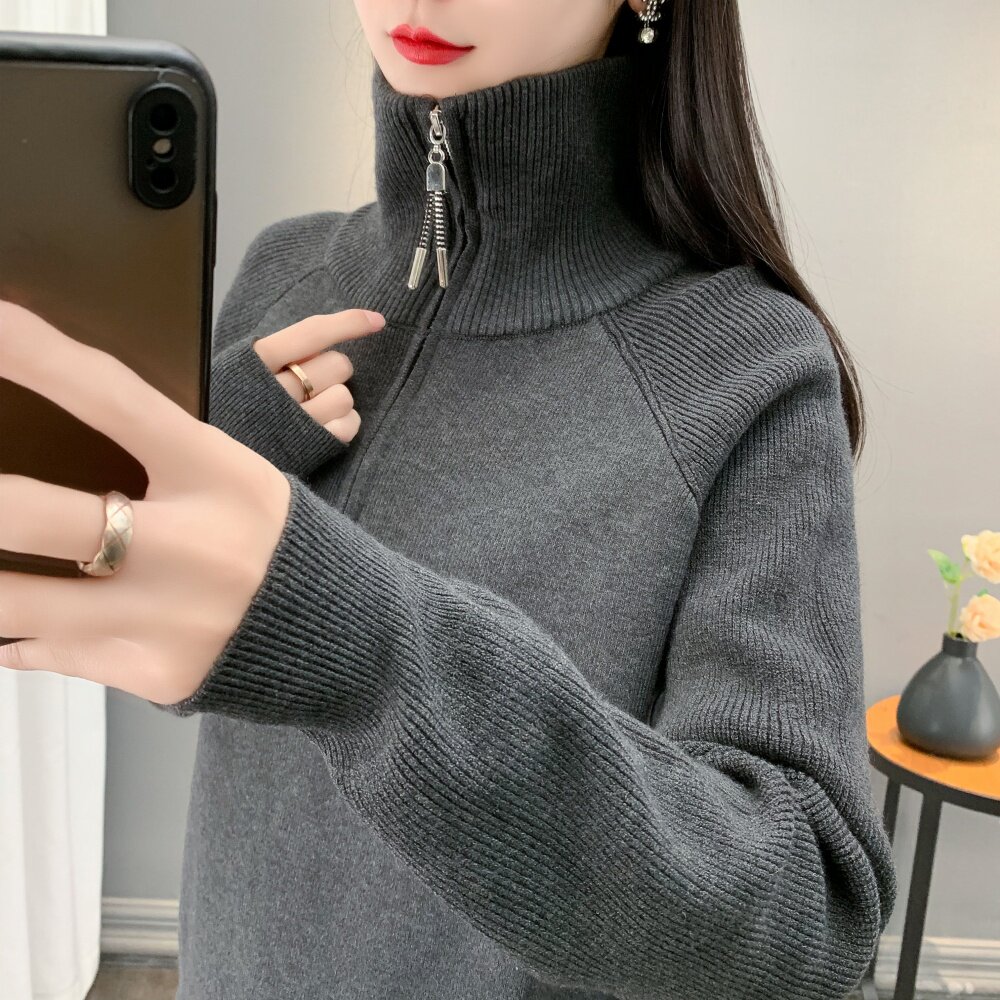 设计感高翻领女士2025秋冬季新款加厚长袖套头半拉链针织毛衣外套