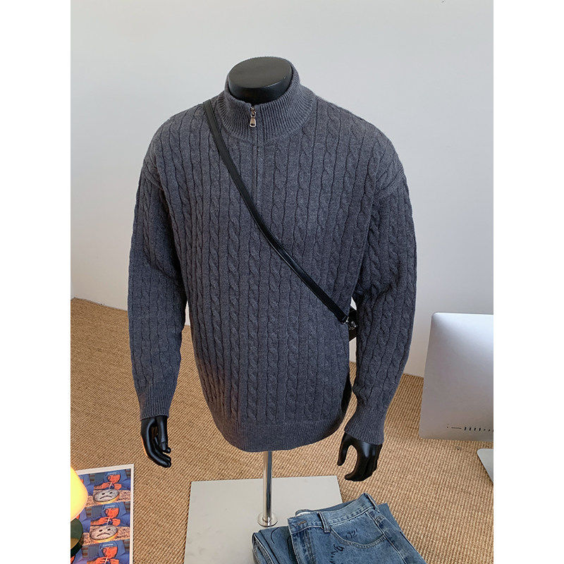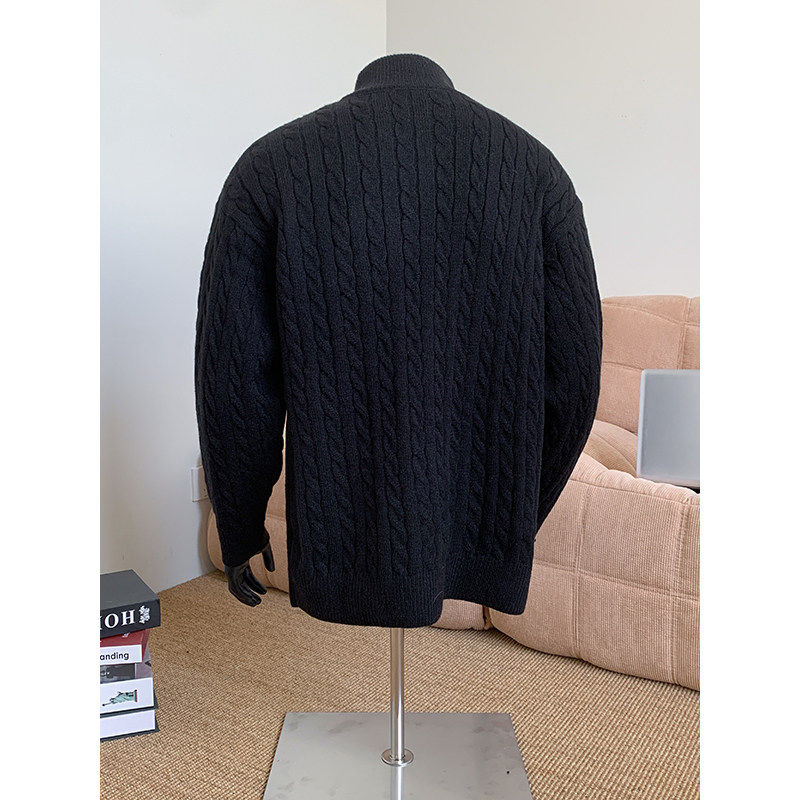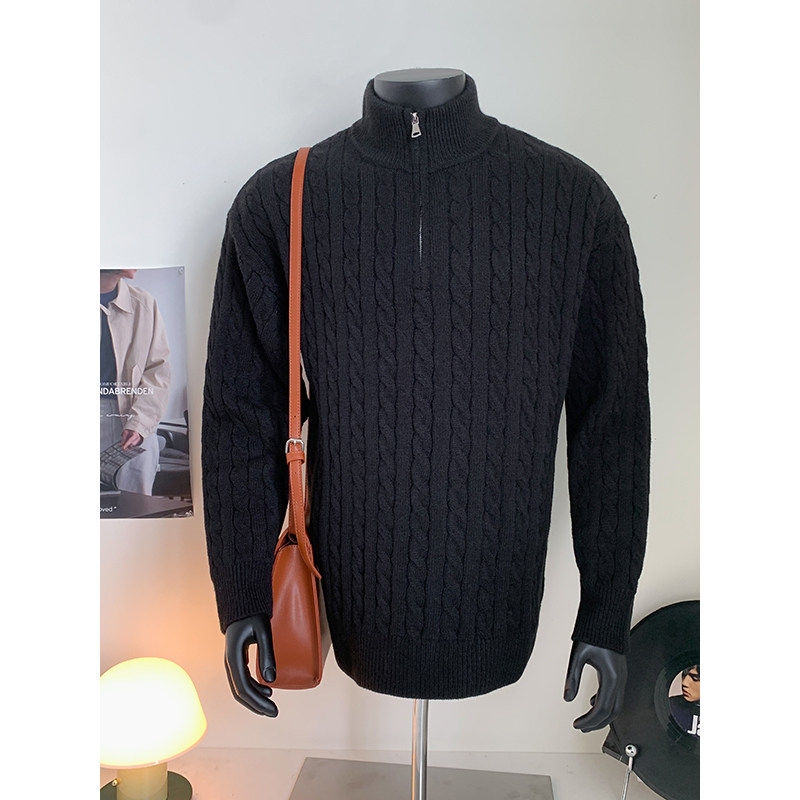 黑色半拉链绞花毛衣男款冬季加厚半高领针织衫内搭打底中领毛线衣