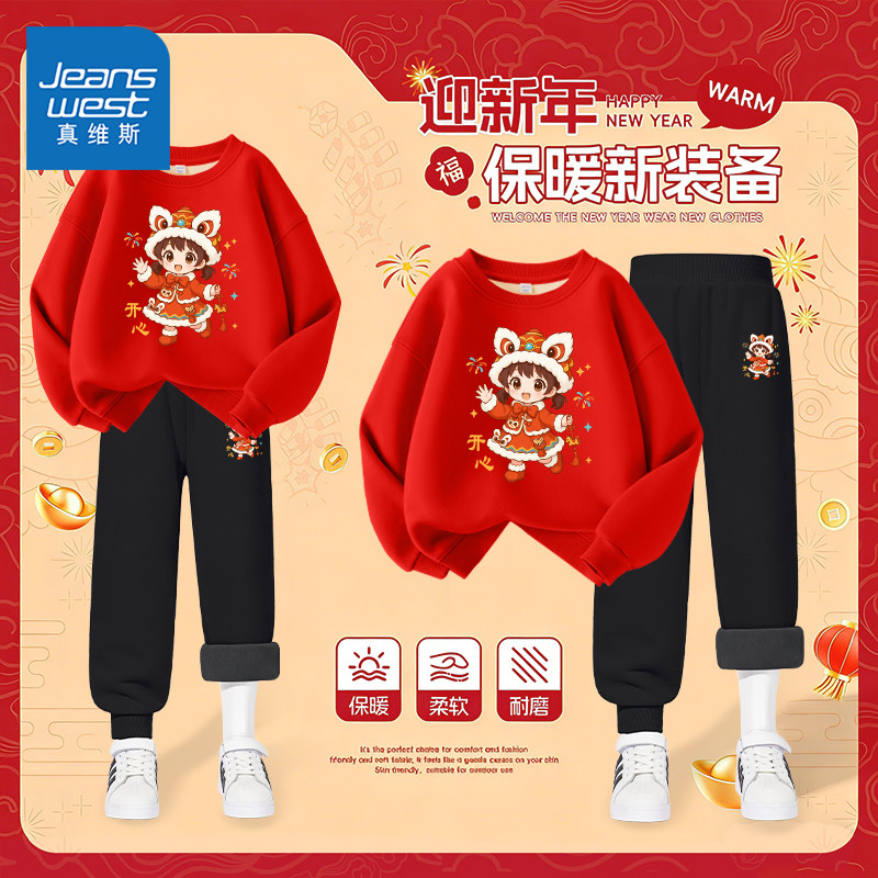 真维斯童装男童红色套装秋冬款儿童马年本命年卫衣男孩加绒拜年服