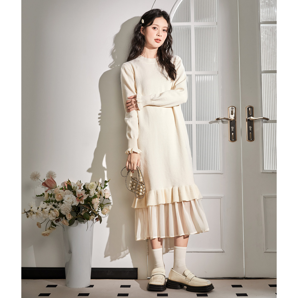 唐狮冬季白色针织连衣裙女中长款毛衣裙内搭打底裙配大衣小个子TD