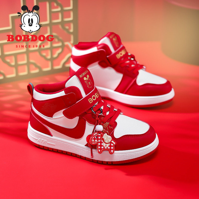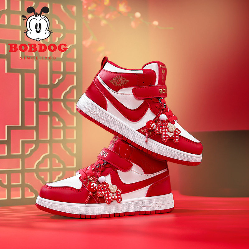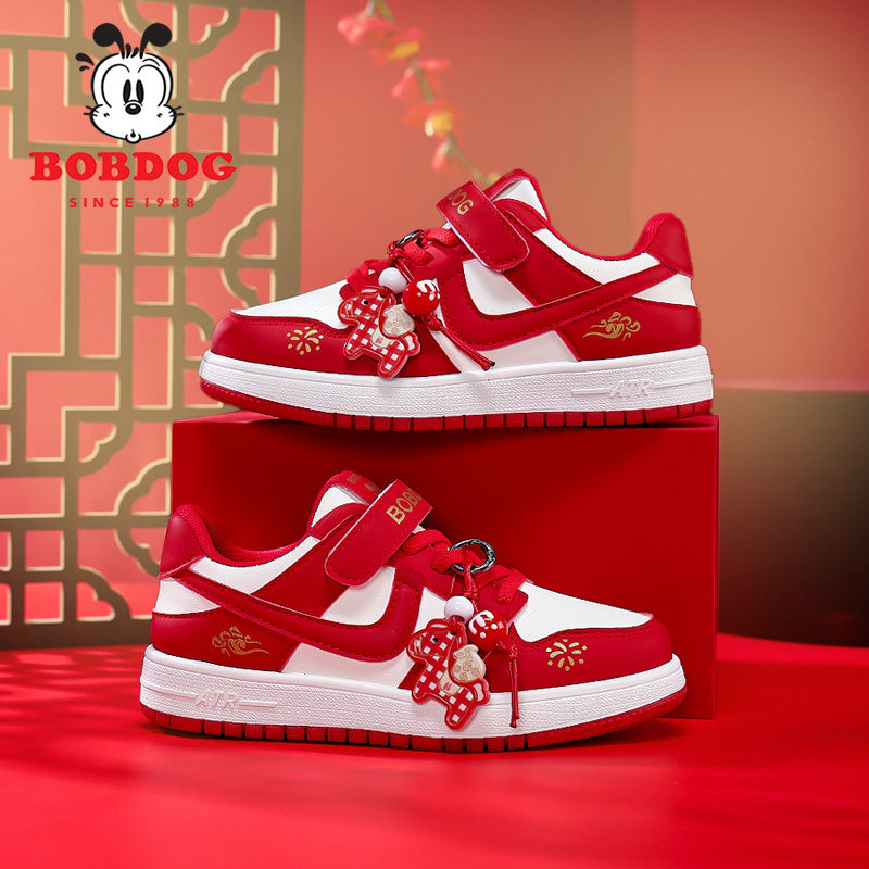 巴布豆童鞋男童板鞋2026秋冬新款皮面女童红色新年限定儿童运动鞋