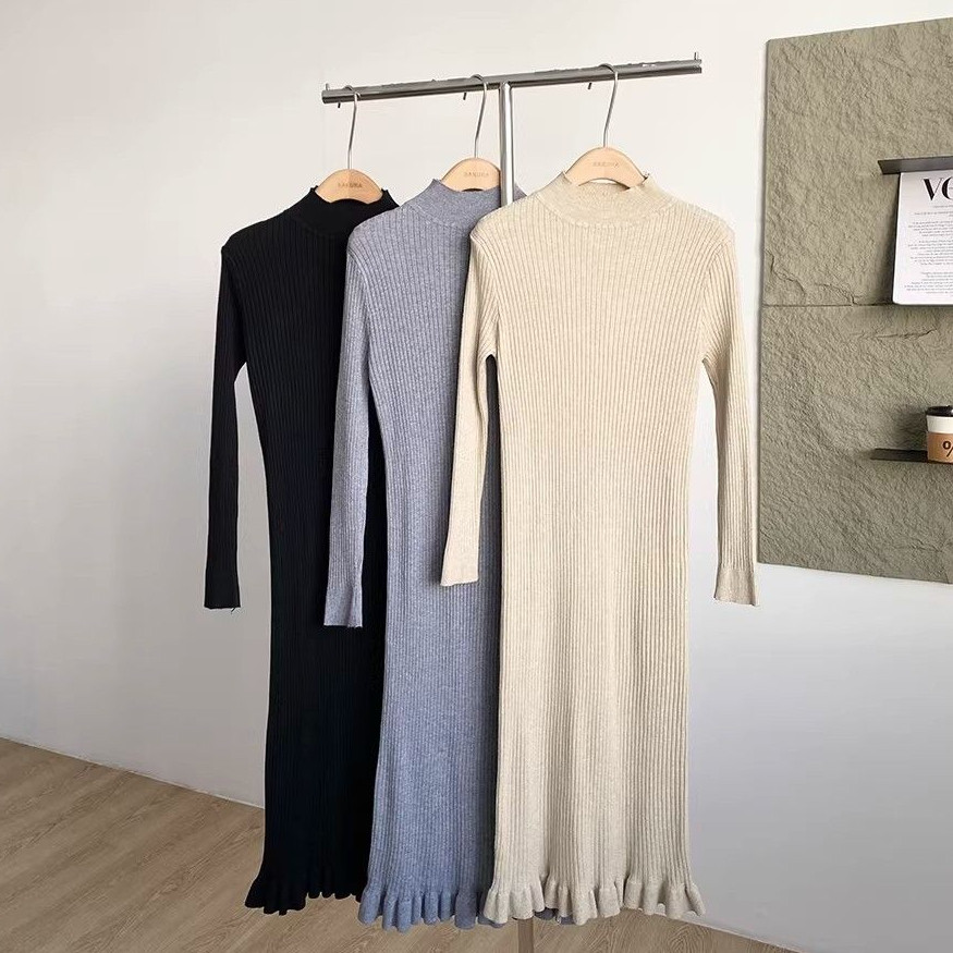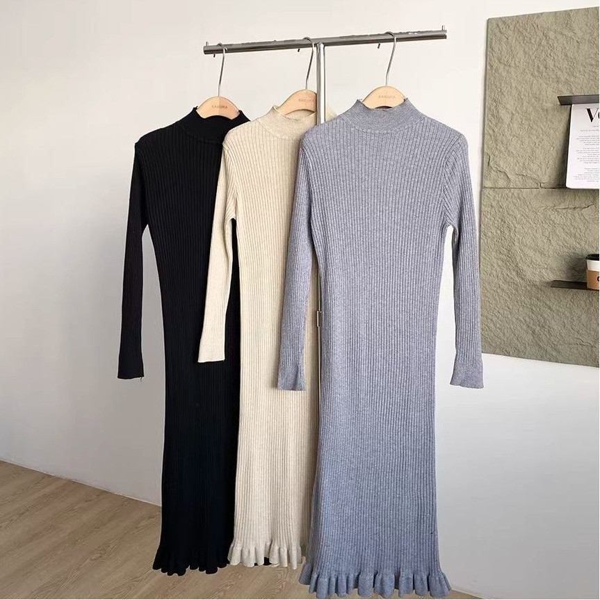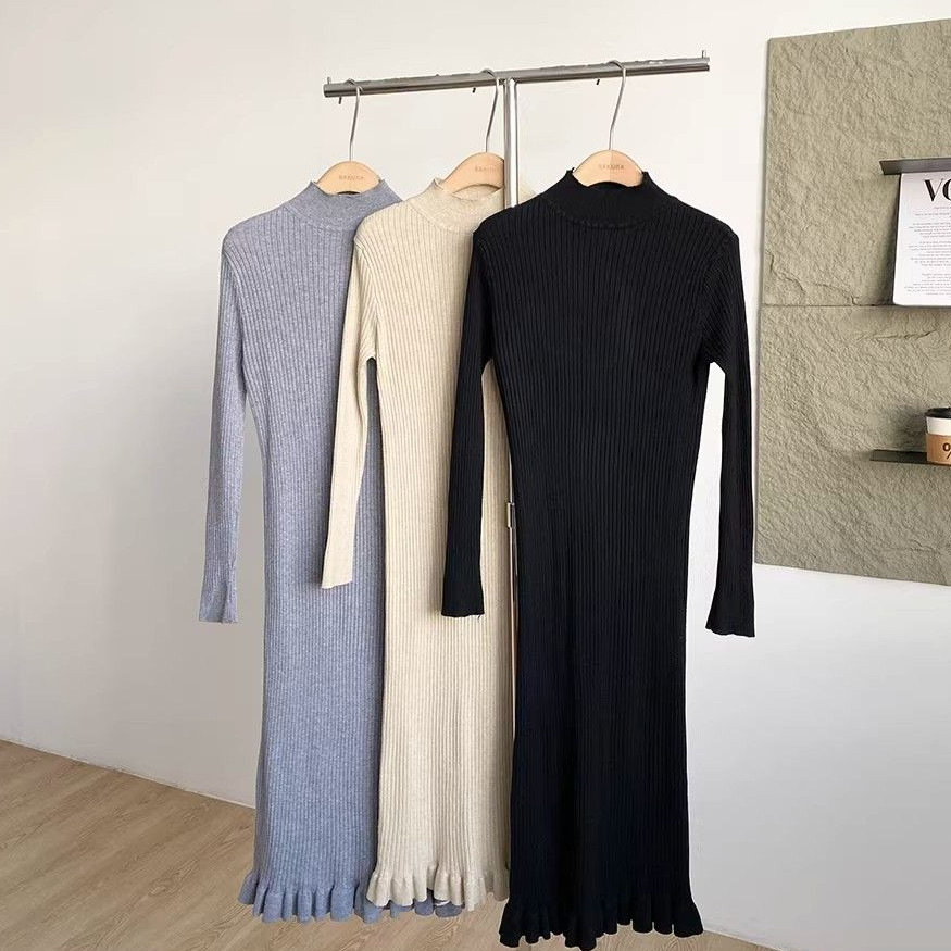 法式温柔风半高领长袖针织连衣裙女设计修身显瘦收腰气质长裙ins