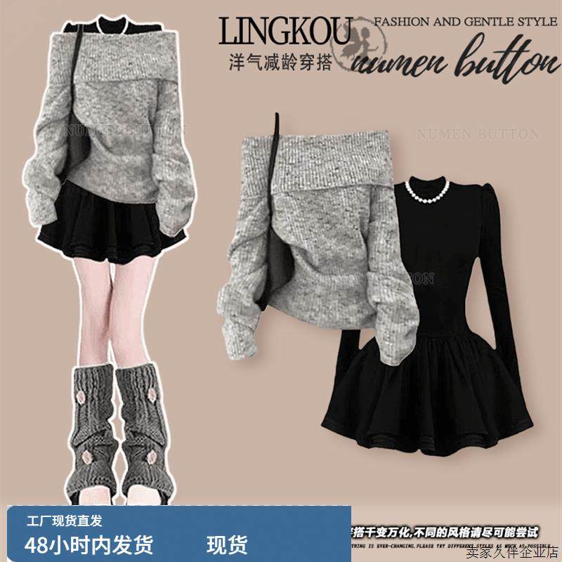 大码秋季绝美套装女高级感露肩针织毛衣搭配轻奢减龄连衣裙两件套
