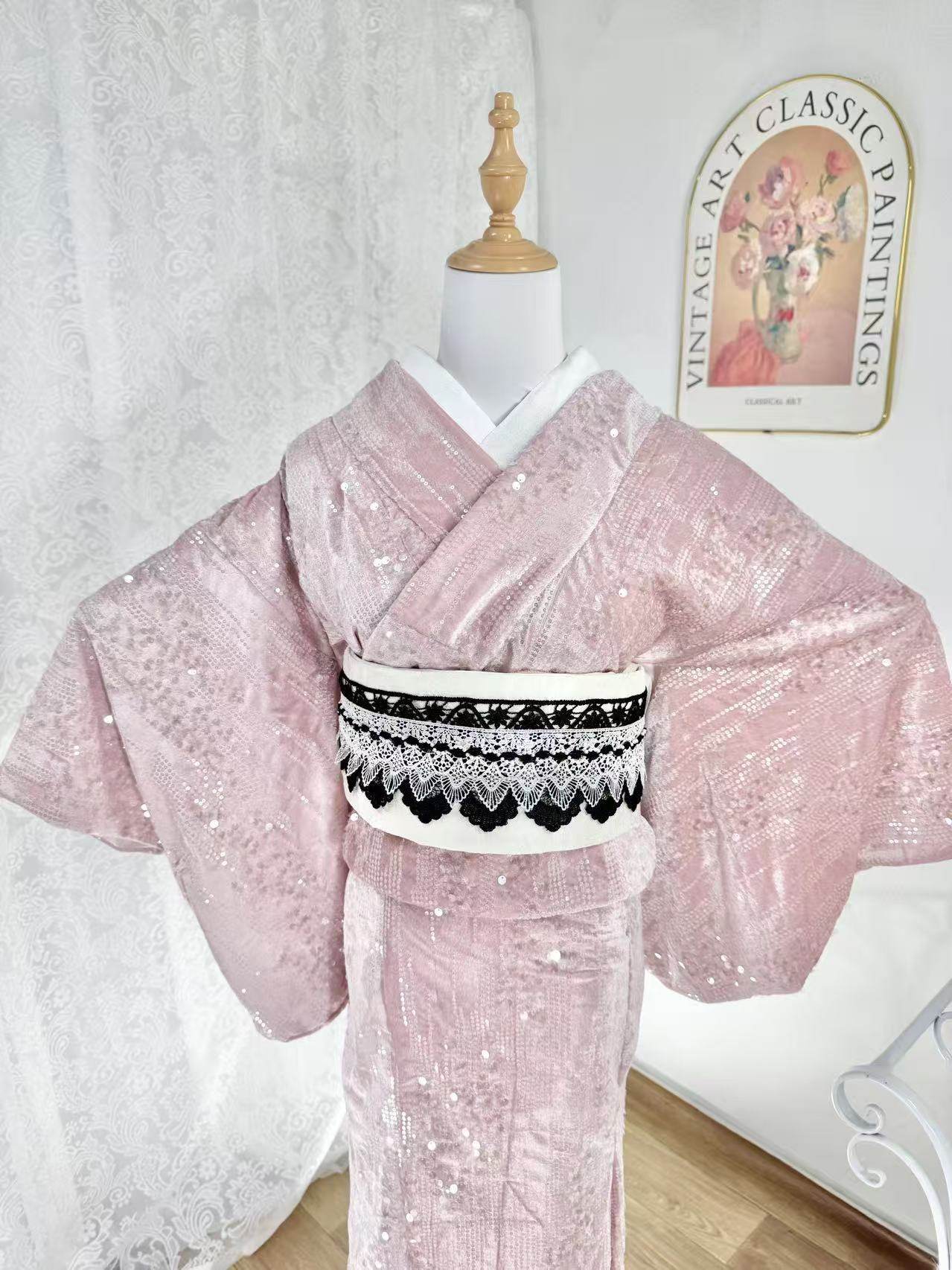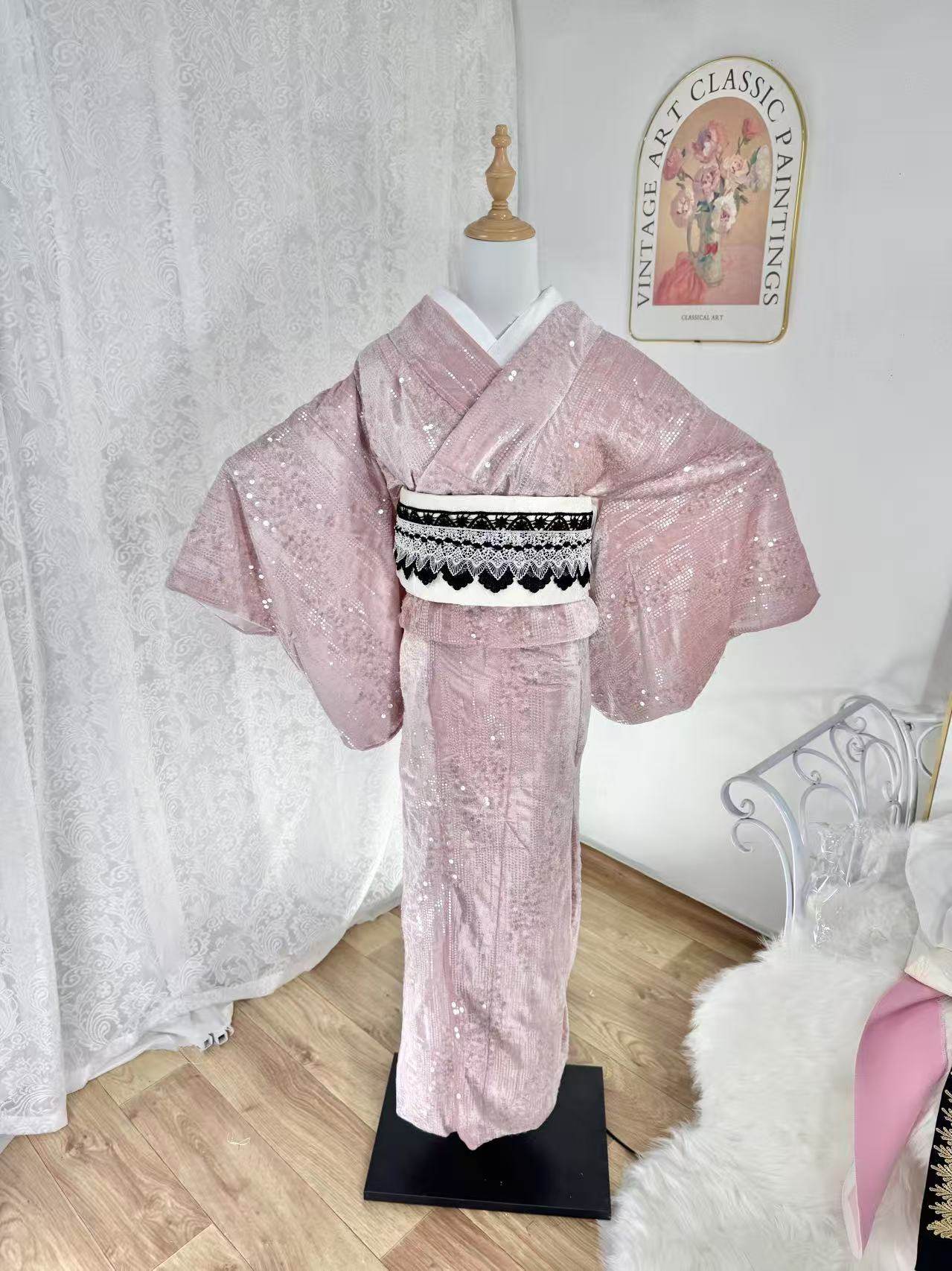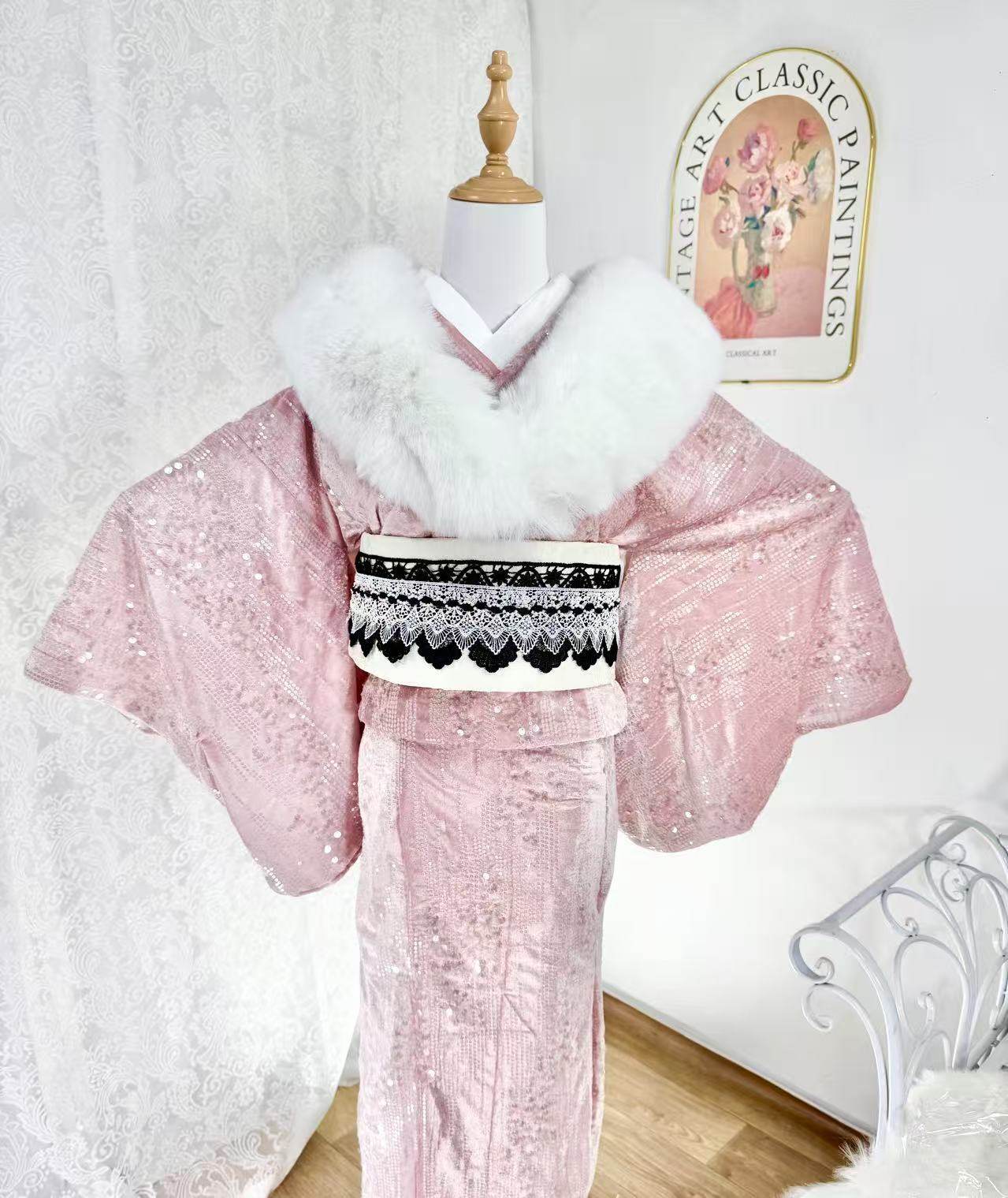 出口日本甯芯斋冬季加厚绒面和服正统分体三部式黑白粉色女装套装