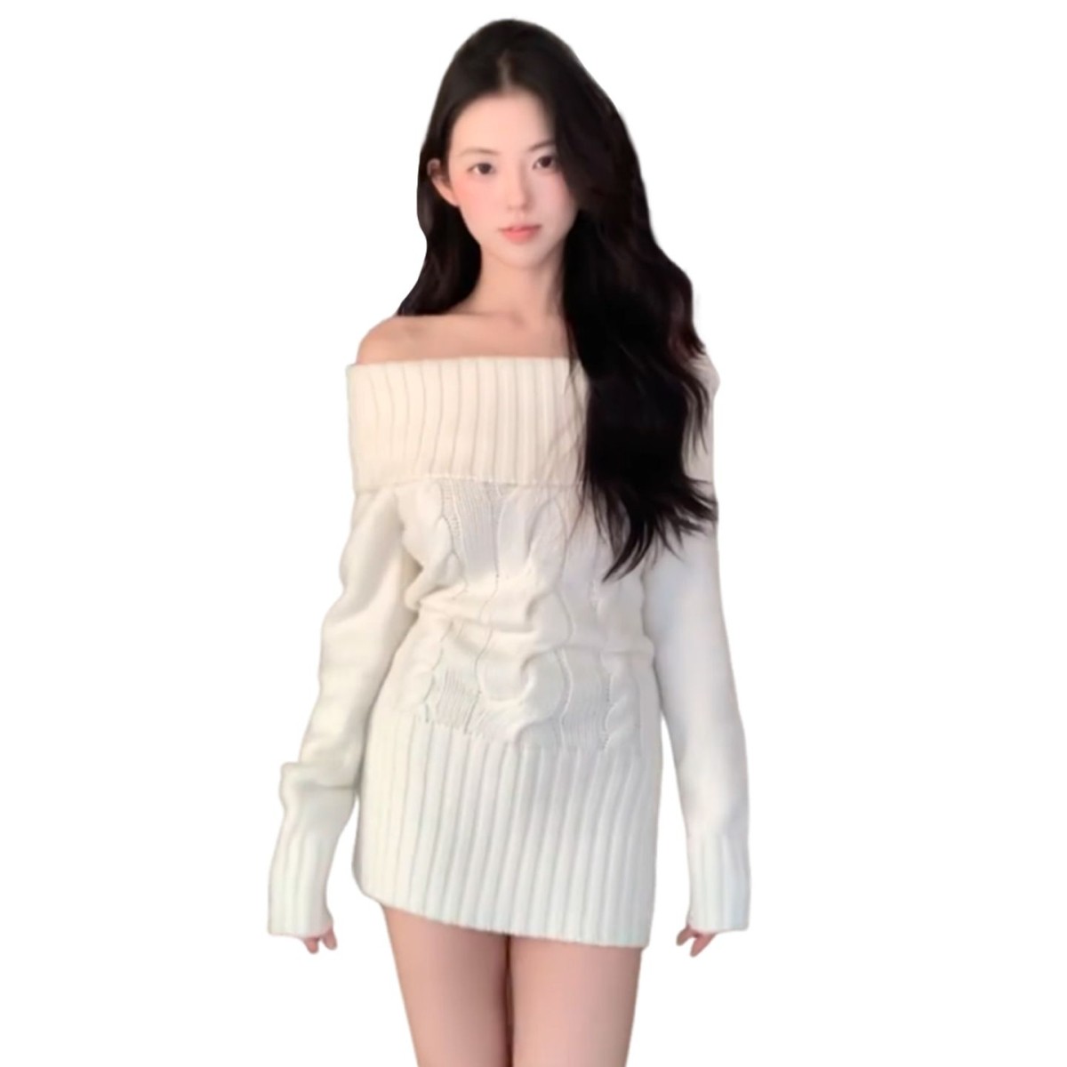 白色一字肩针织毛衣连衣裙子女秋冬季2026新款配大衣内搭包臀短裙