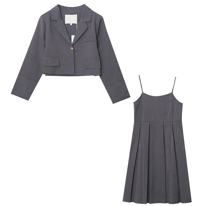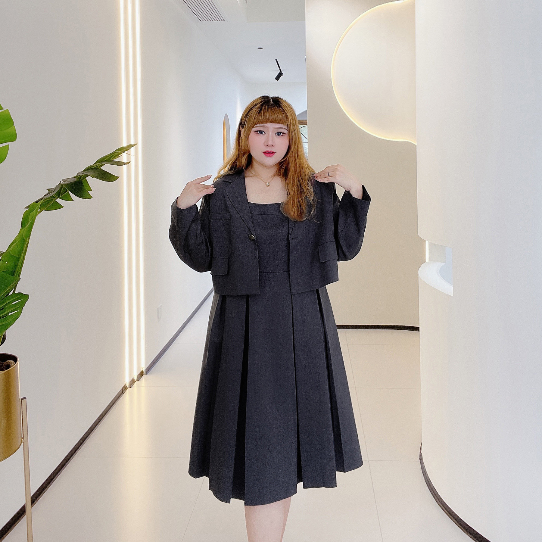 长短款胖仙女莹莹大码女装胖mm秋韩版气质通勤西服百褶连衣裙套装