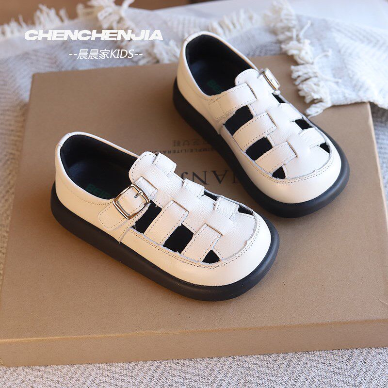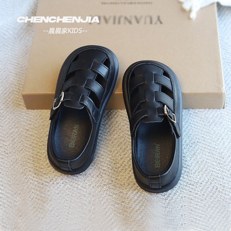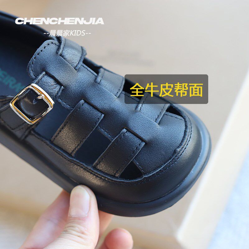 女童凉鞋包头镂空夏款皮鞋头层牛皮新款男童黑色夏季宝宝包脚鞋子