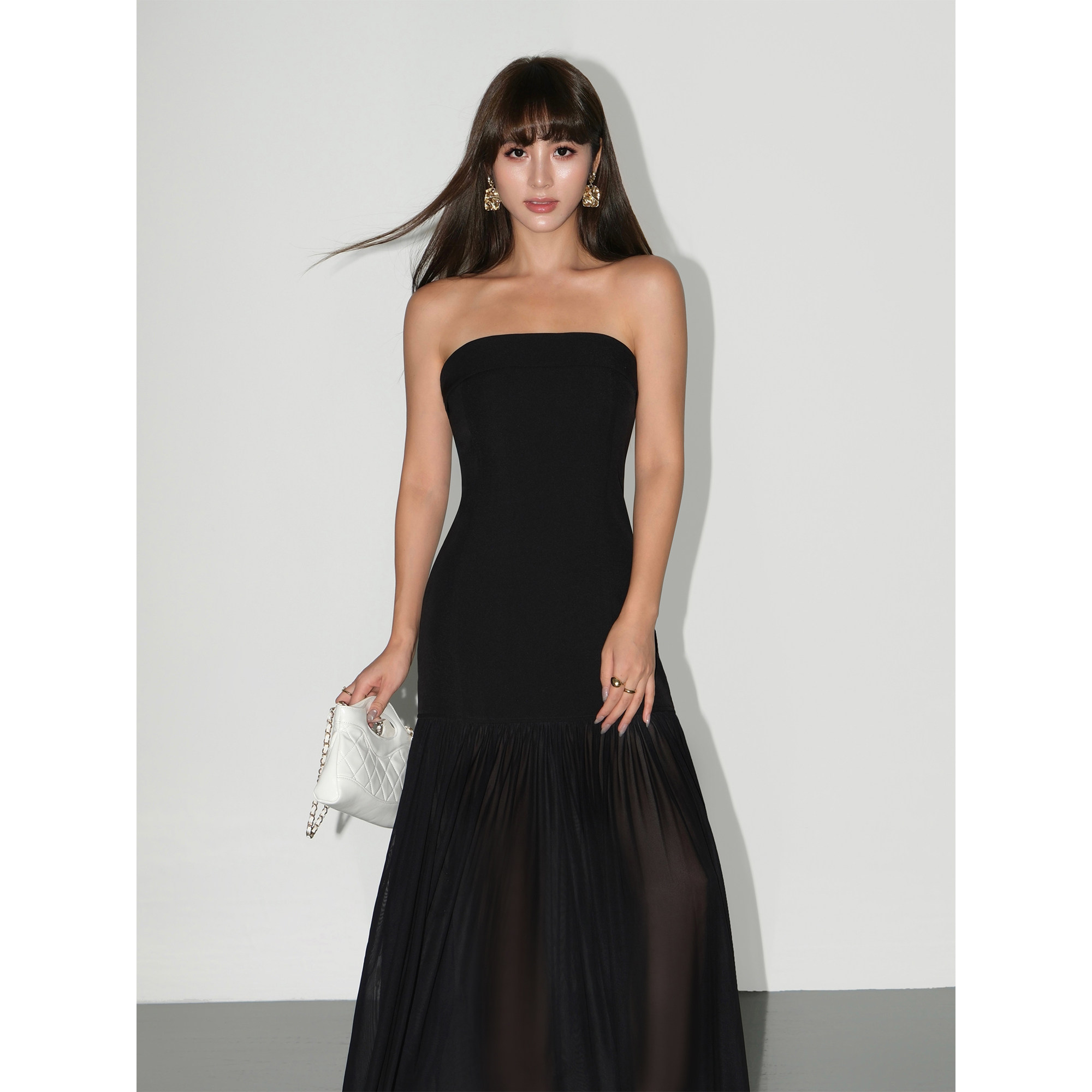 NEVA HU 黑色性感抹胸连衣裙女吊带修身包臀裙拼接网纱飘逸长裙