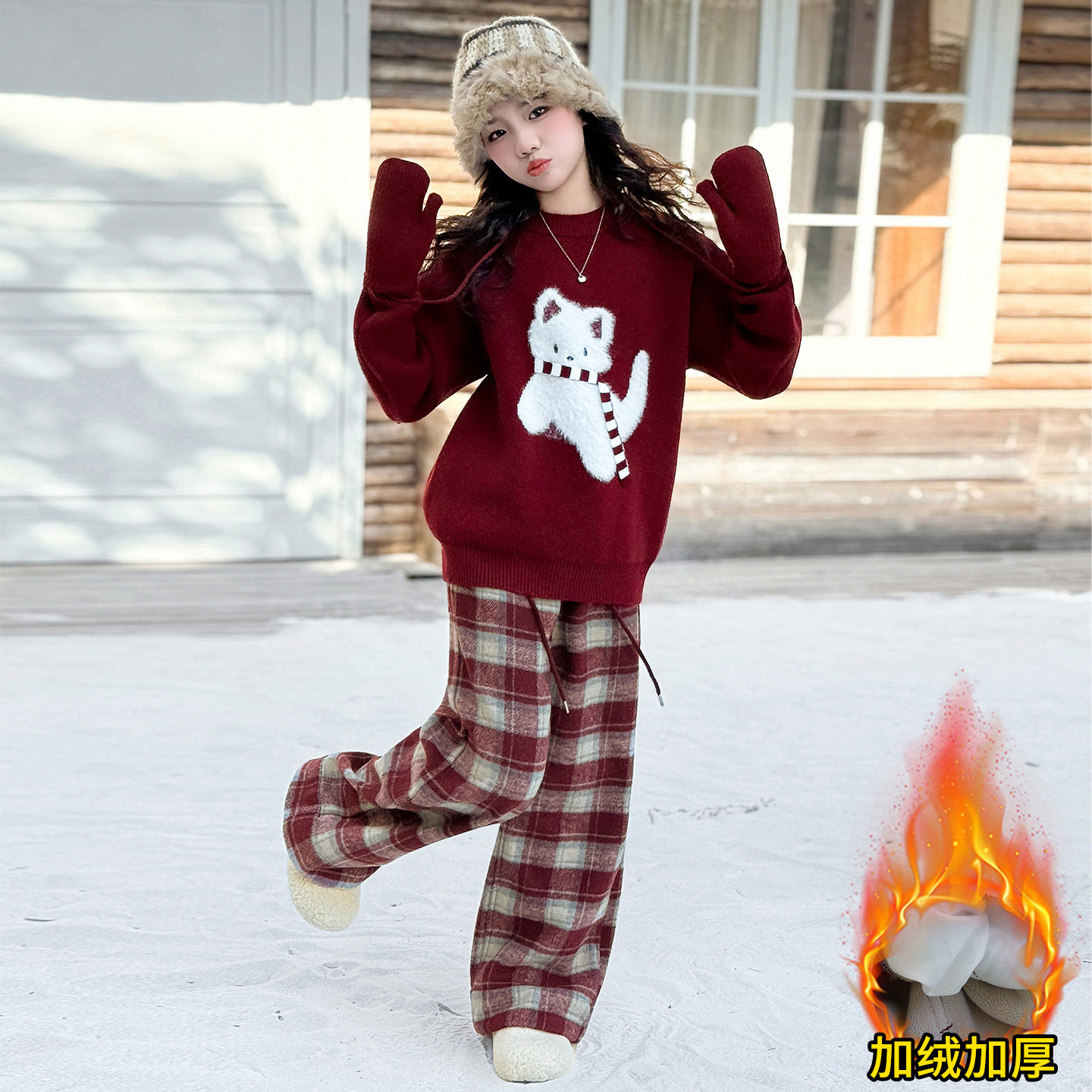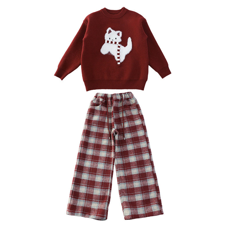 女童红色毛衣套装冬装2026新款初中生新年穿搭女孩衣服