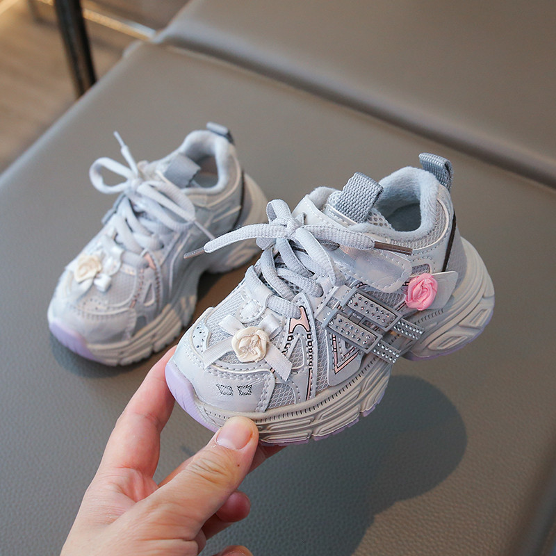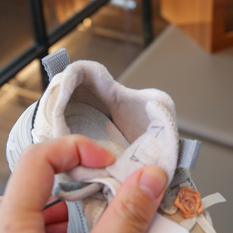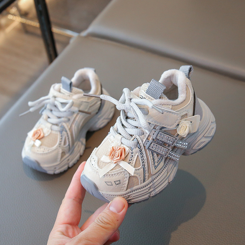 女童老爹鞋2025冬季新款加绒水钻蝴蝶结公主皮面运动鞋二棉休闲鞋