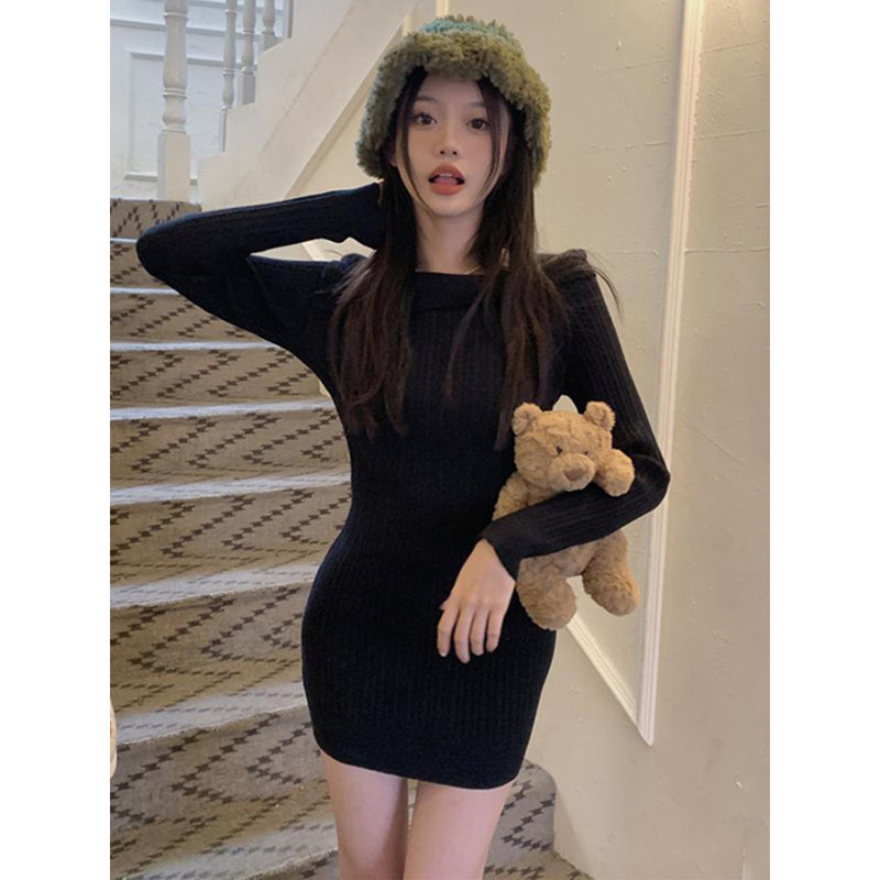 纯欲辣妹紧身包臀裙秋冬女内搭斜肩针织毛衣修身短款长袖连衣裙子
