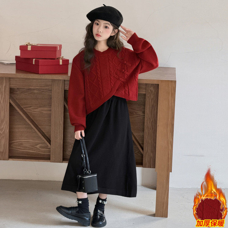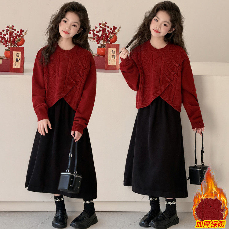 女童加厚毛衣裙两件套红色新年装连衣裙套装秋冬拜年服新中式裙子