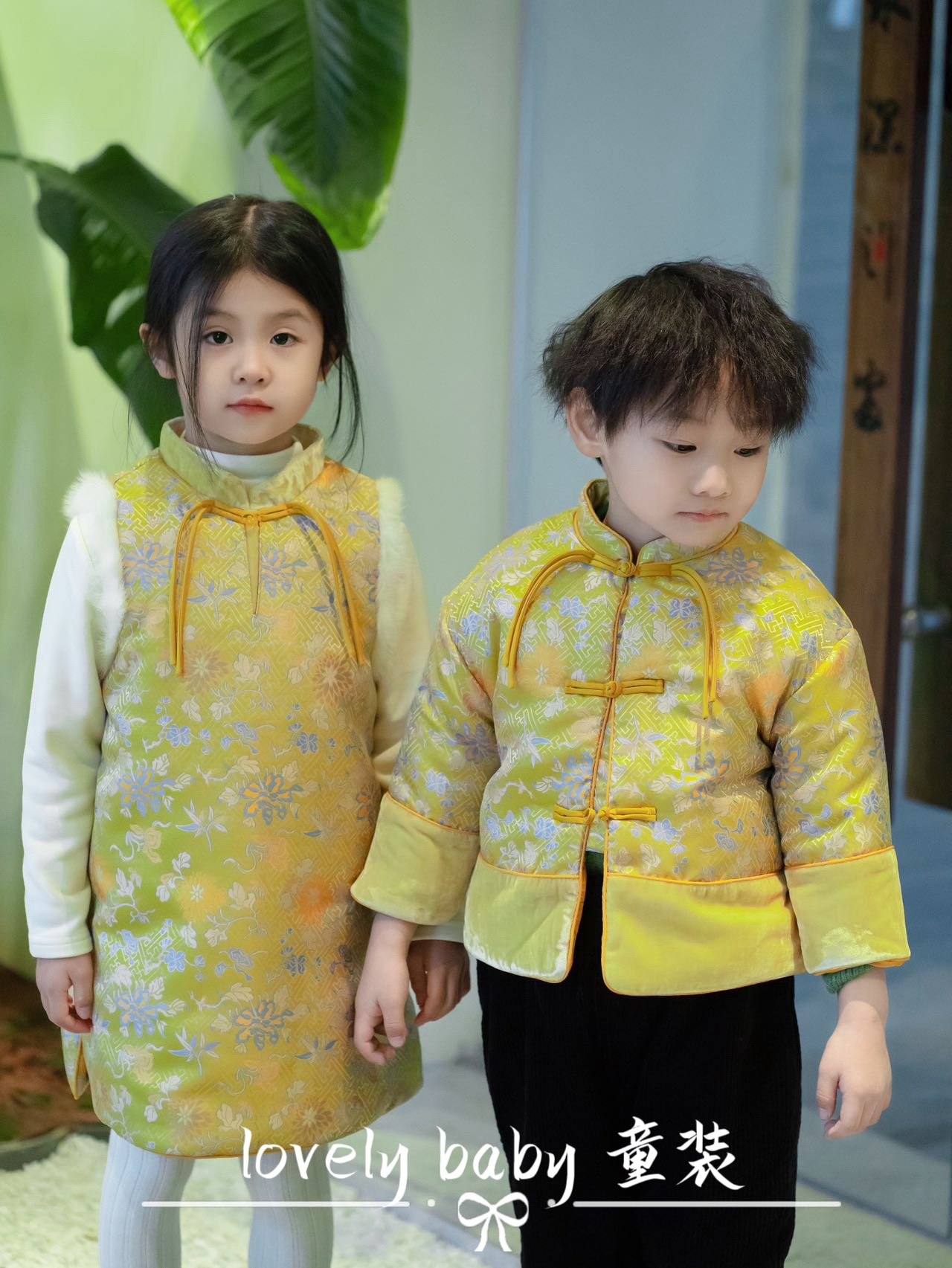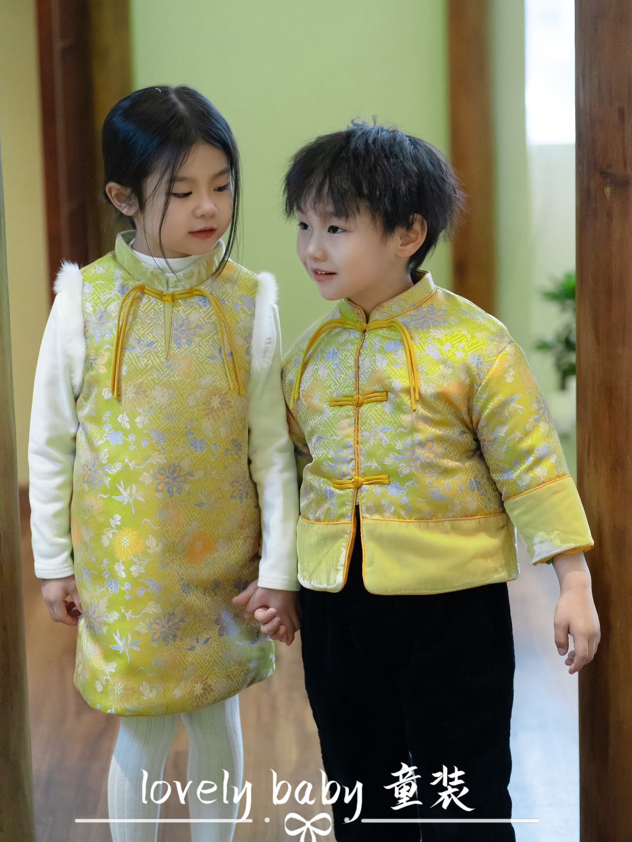 冬—富贵花加厚年服姐弟装男童女童纯棉中国风改良旗袍马甲对襟