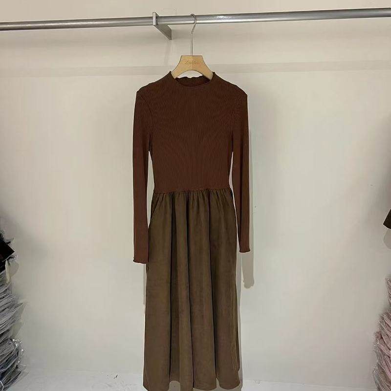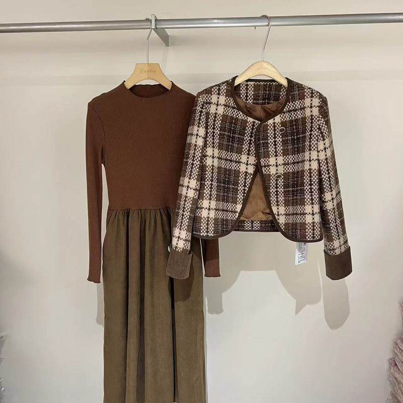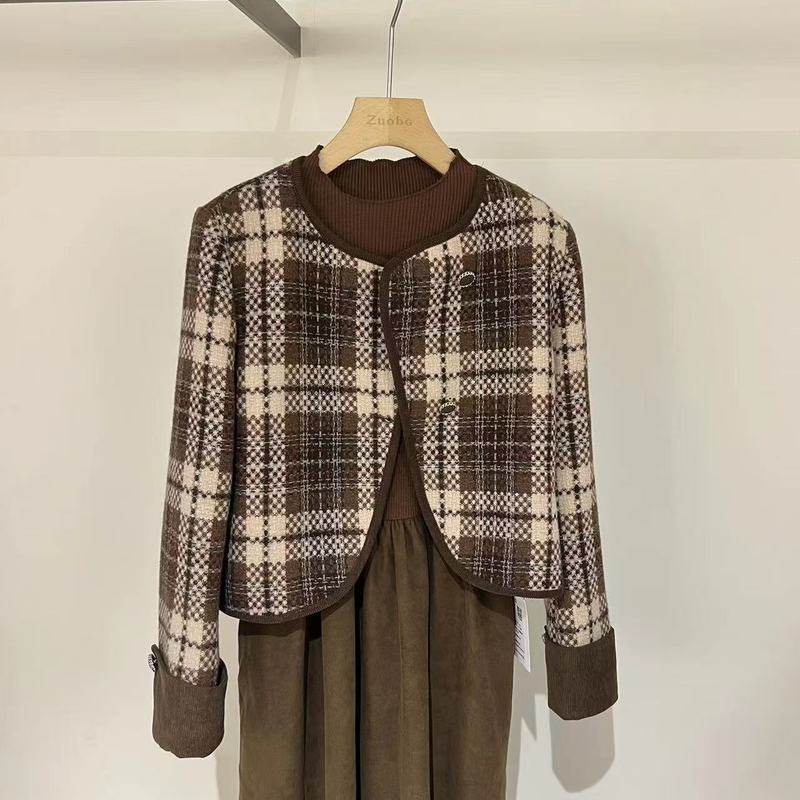 小香风复古格子外套针织拼接连衣裙两件套女秋款2024新小个子上衣