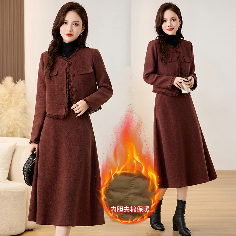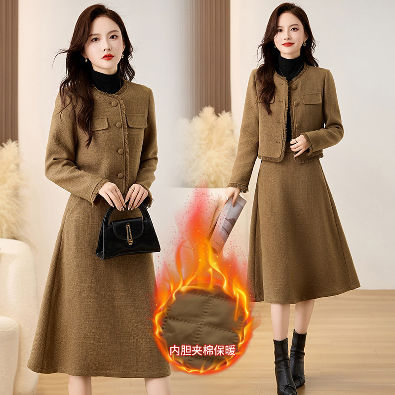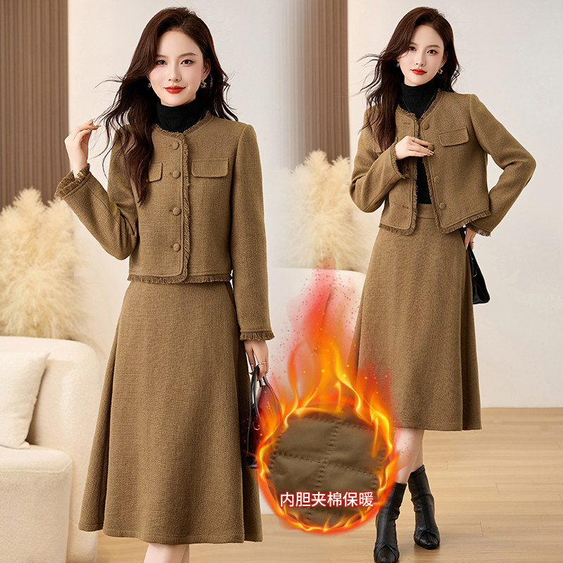 时尚夹棉毛呢套装裙子秋冬新款女小香风加厚呢子外套半身裙两件套