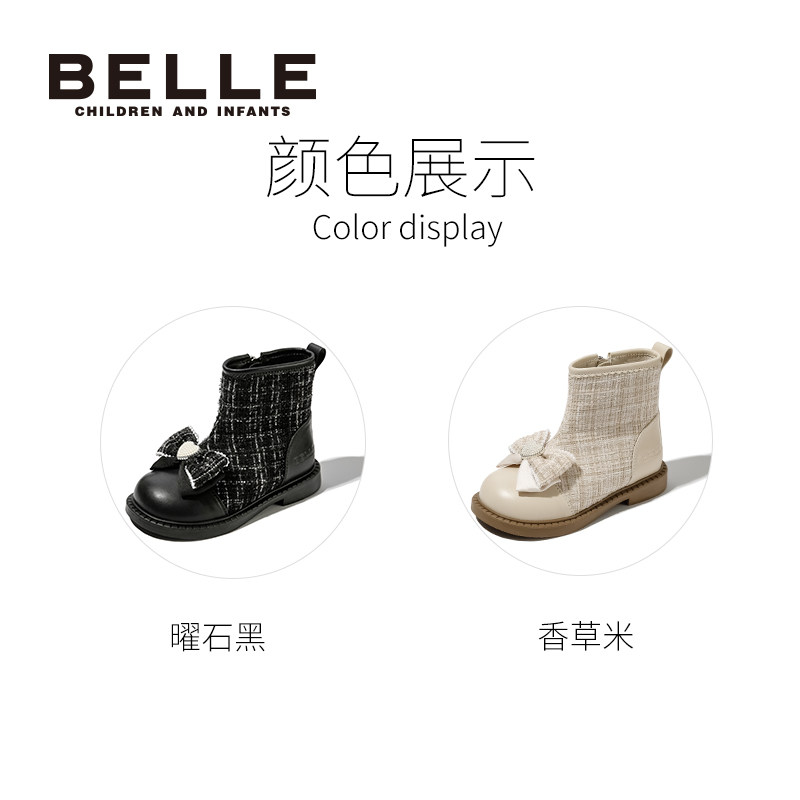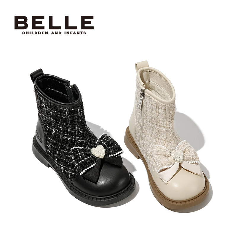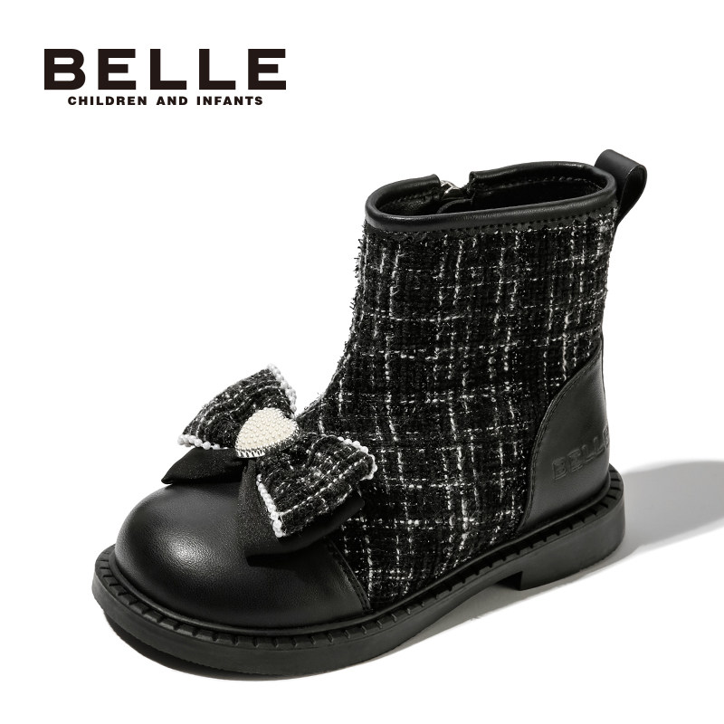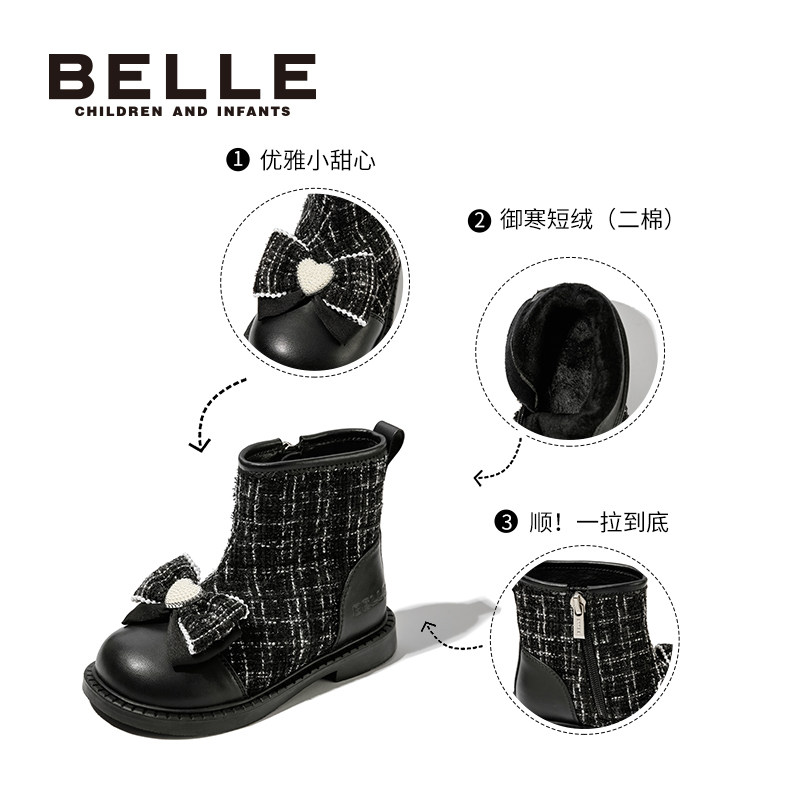 百丽童鞋女童短靴冬季加绒保暖时装靴儿童舒适软底皮靴女孩公主靴