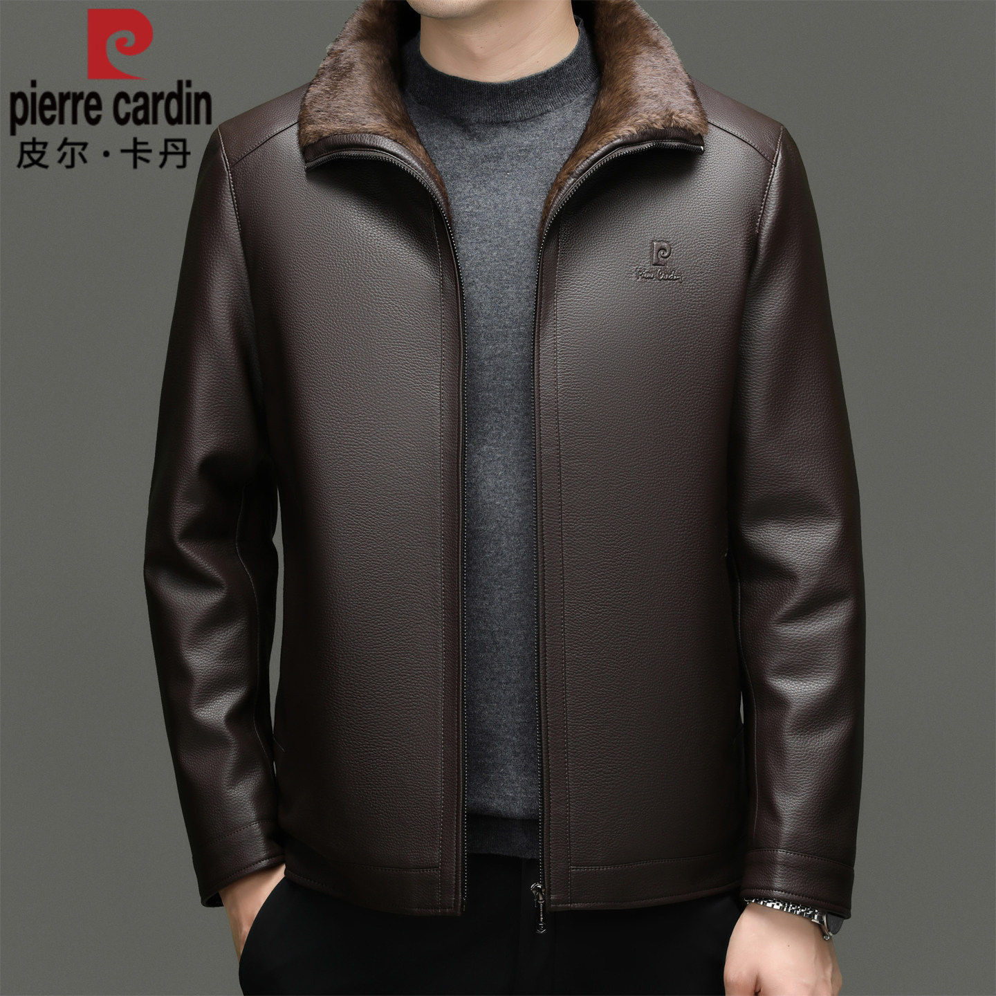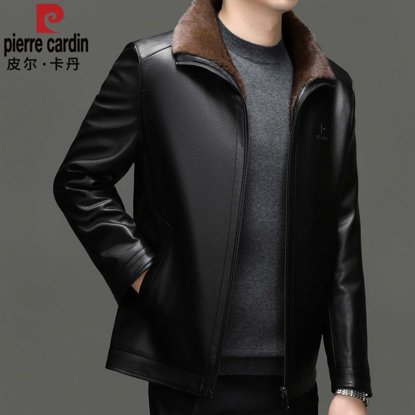 皮尔卡丹皮衣男真皮冬季加绒加厚保暖皮毛一体海宁羊皮中年外套