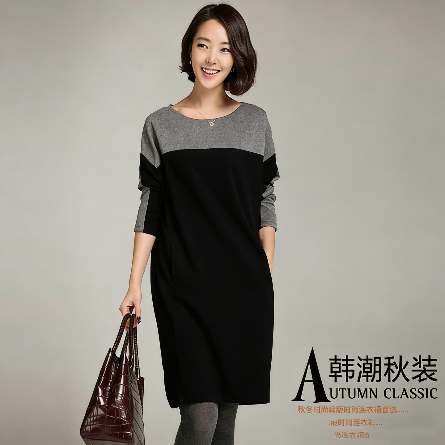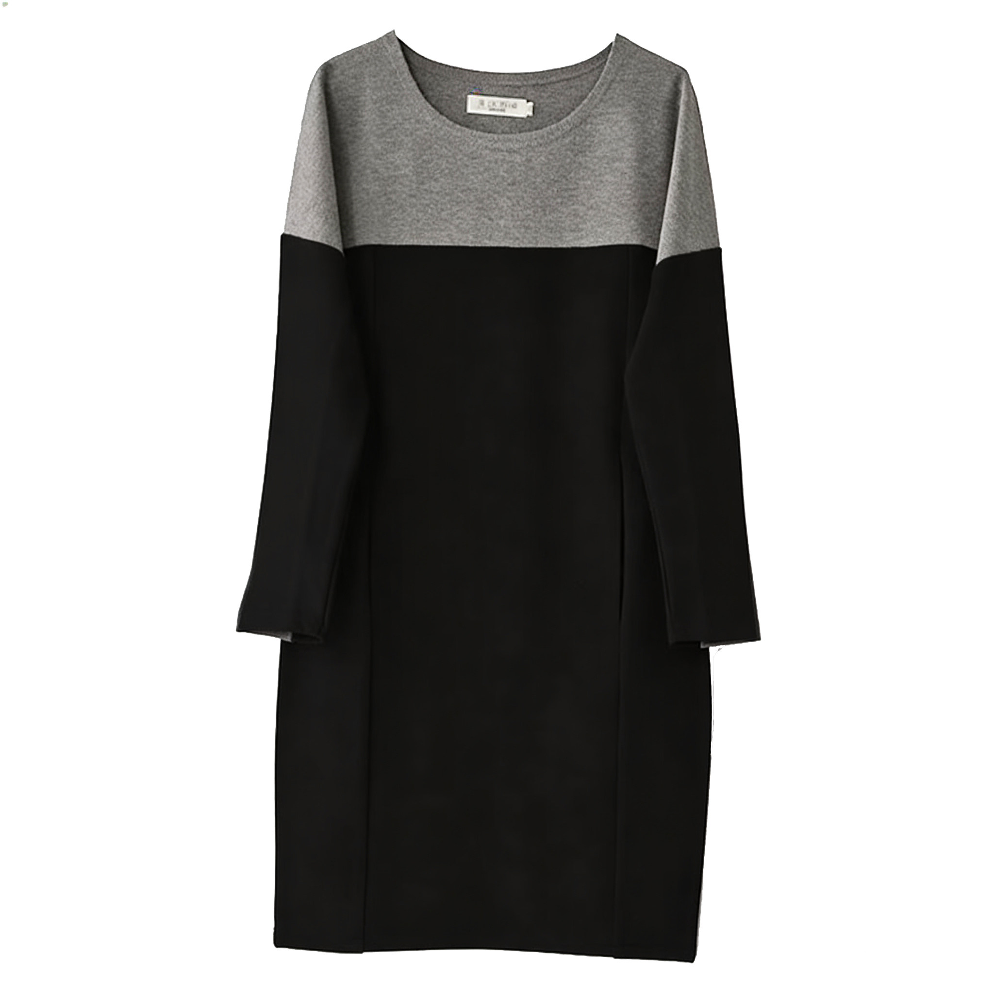春秋加大码高端欧美简约长袖职业装弹力纯棉拼色时尚中长款连衣裙