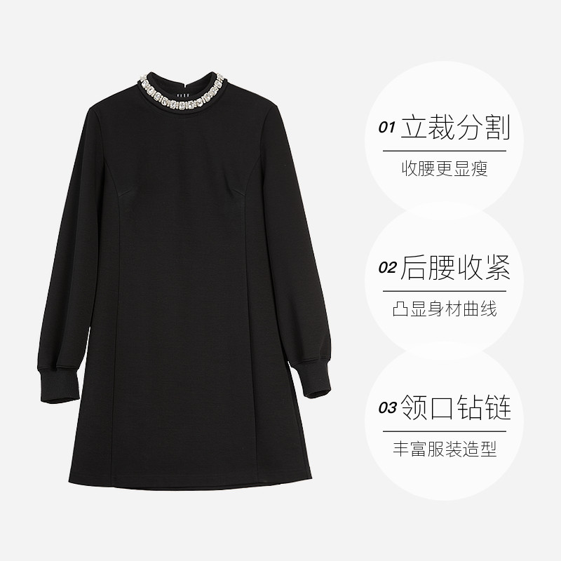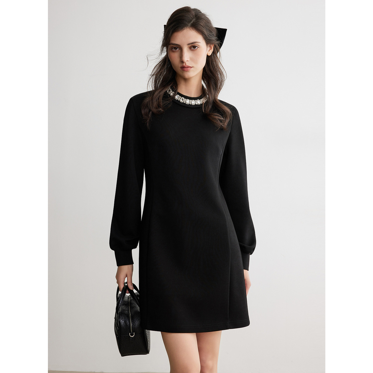 【自营】ELLE黑色重工钻链长袖连衣裙女2026春新款气质直筒小黑裙