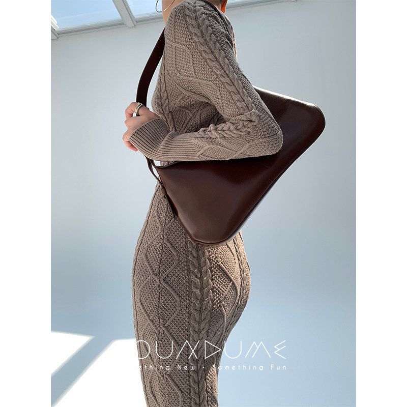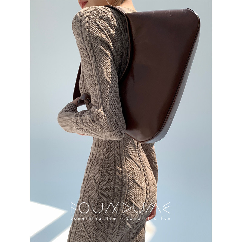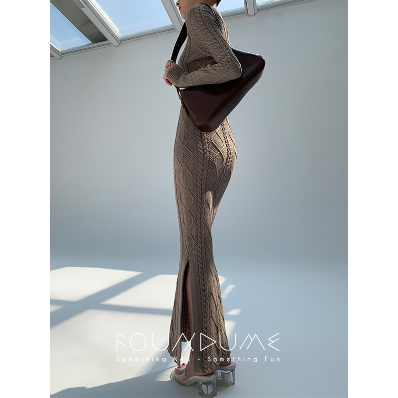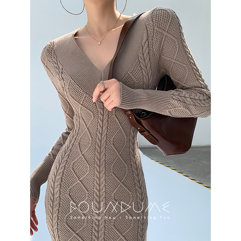 Foundume 新款灰杏仁色立体绞花修身显瘦V领收腰长款针织连衣裙