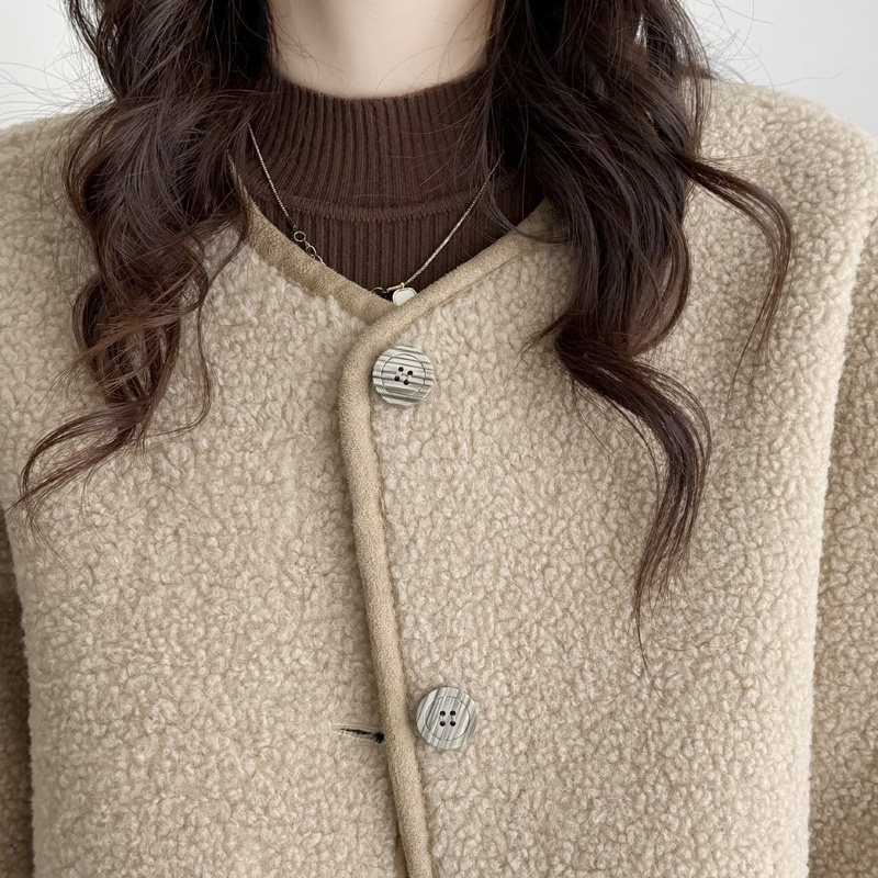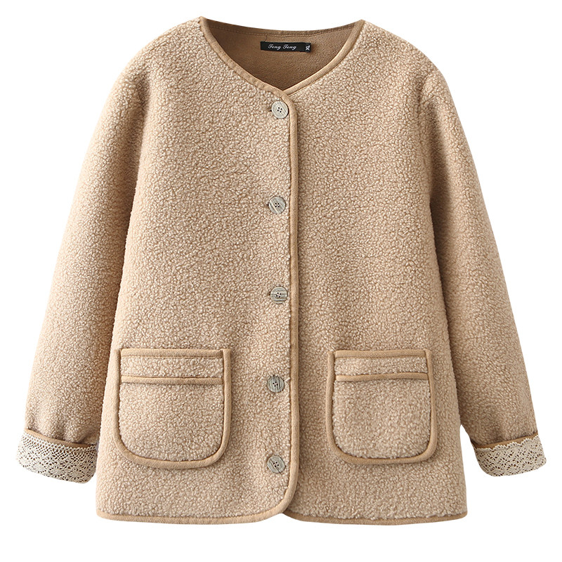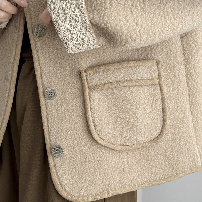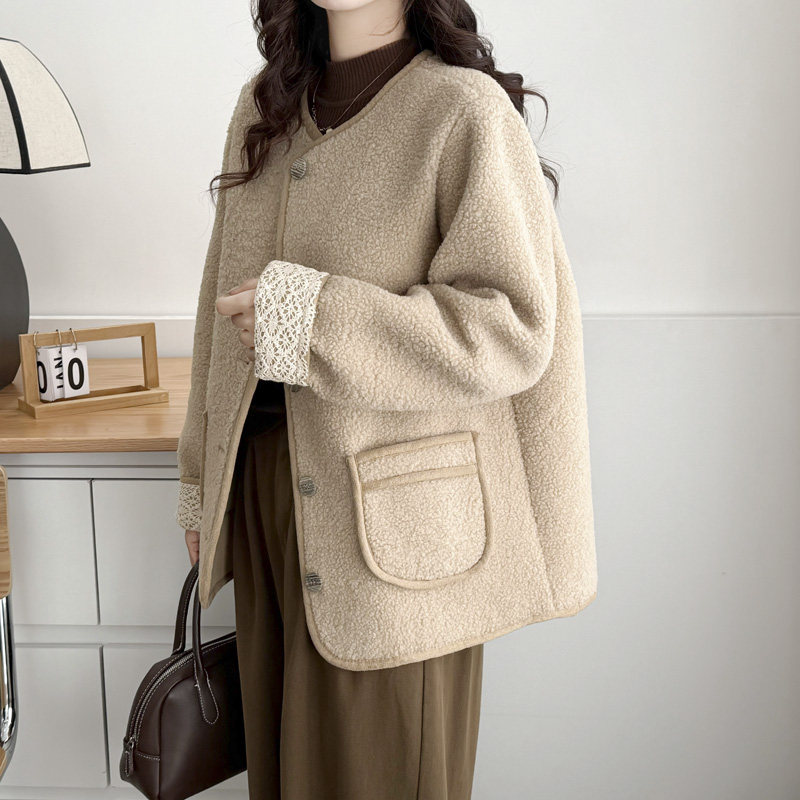 大码外套女胖mm秋冬高级感2024新款时尚蕾丝袖拼接宽松颗粒绒上衣