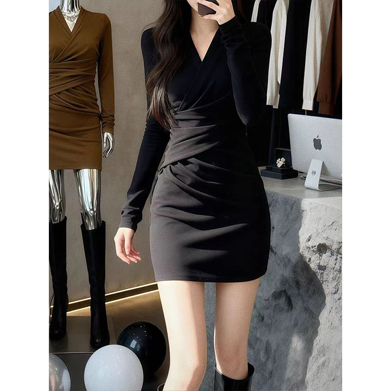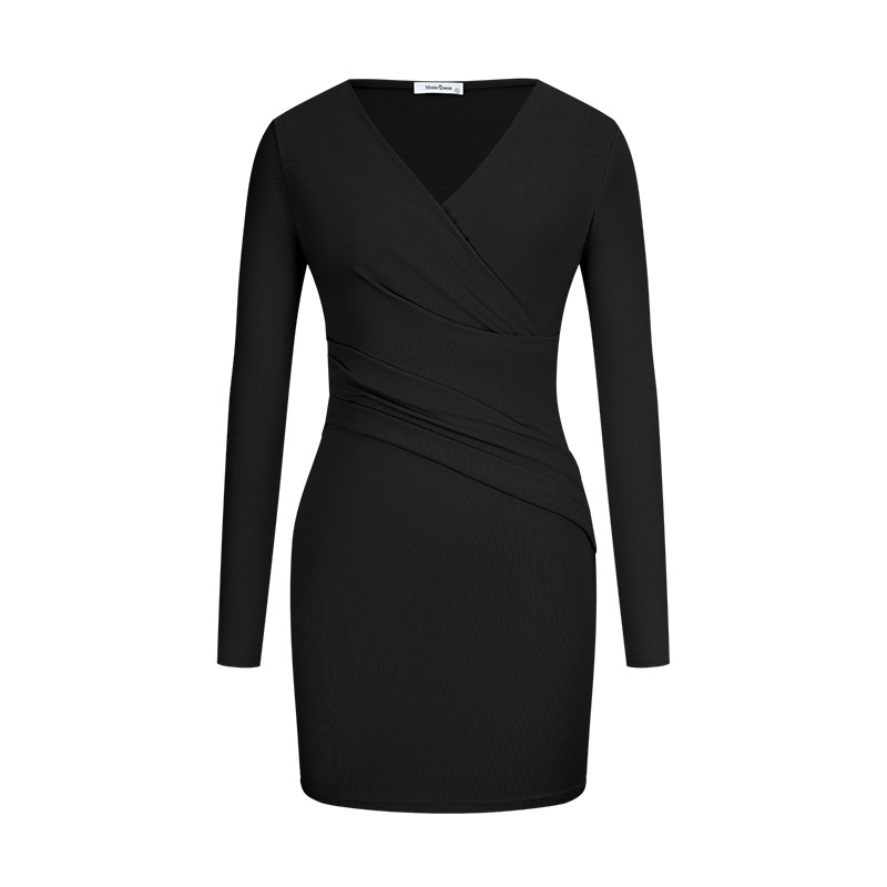 MosesQueen魔西女王黑色v领长袖连衣裙女春季修身显瘦包臀短裙子