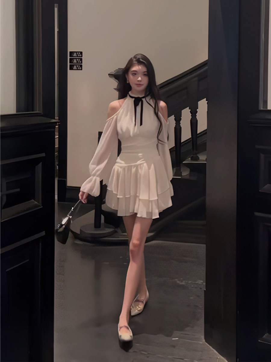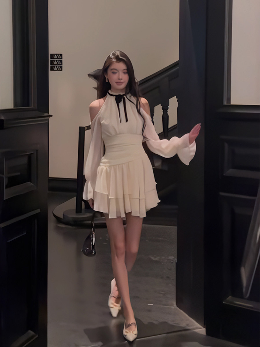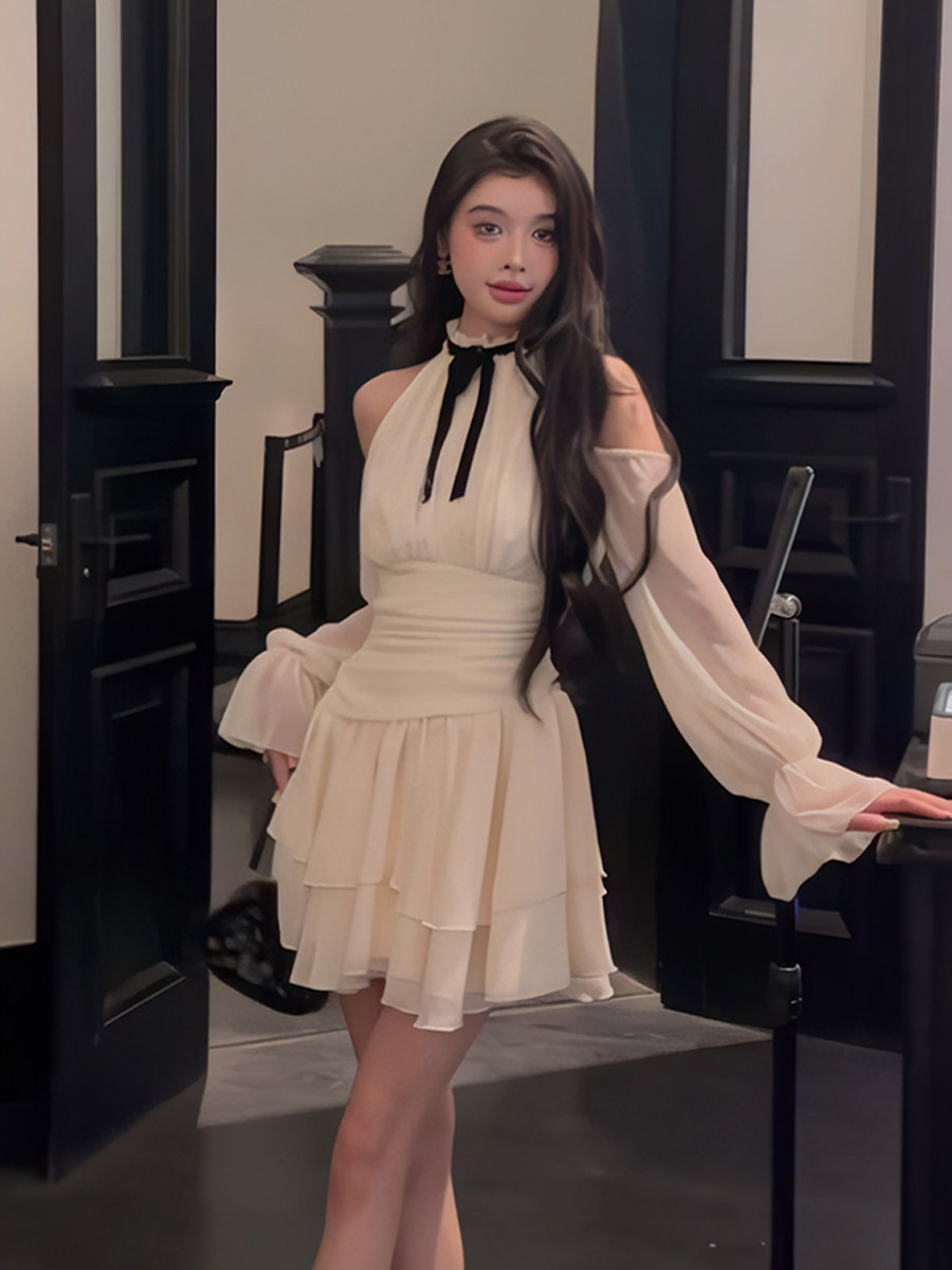 到货春夏纯欲法式露肩挂脖圆领森系甜美收腰显瘦灯笼长袖连衣裙女