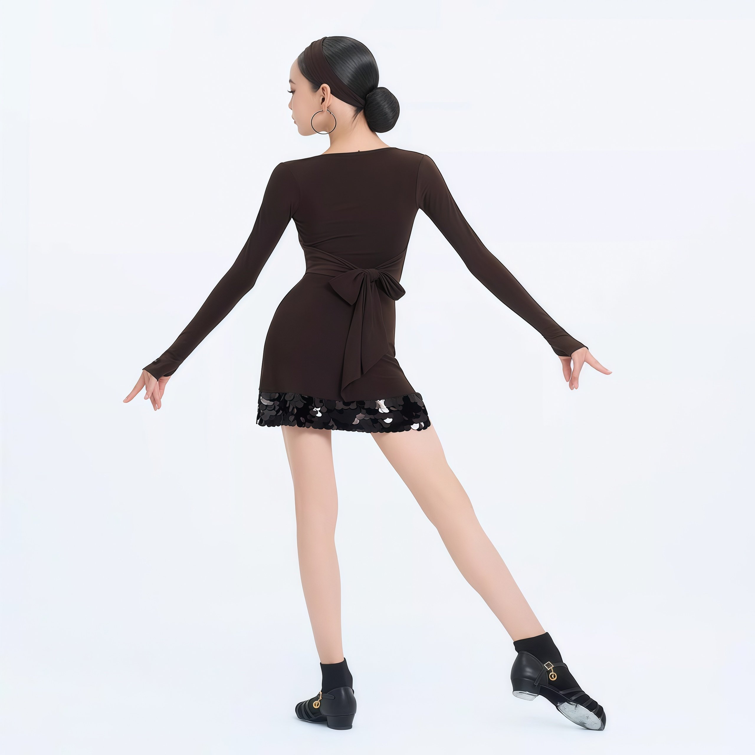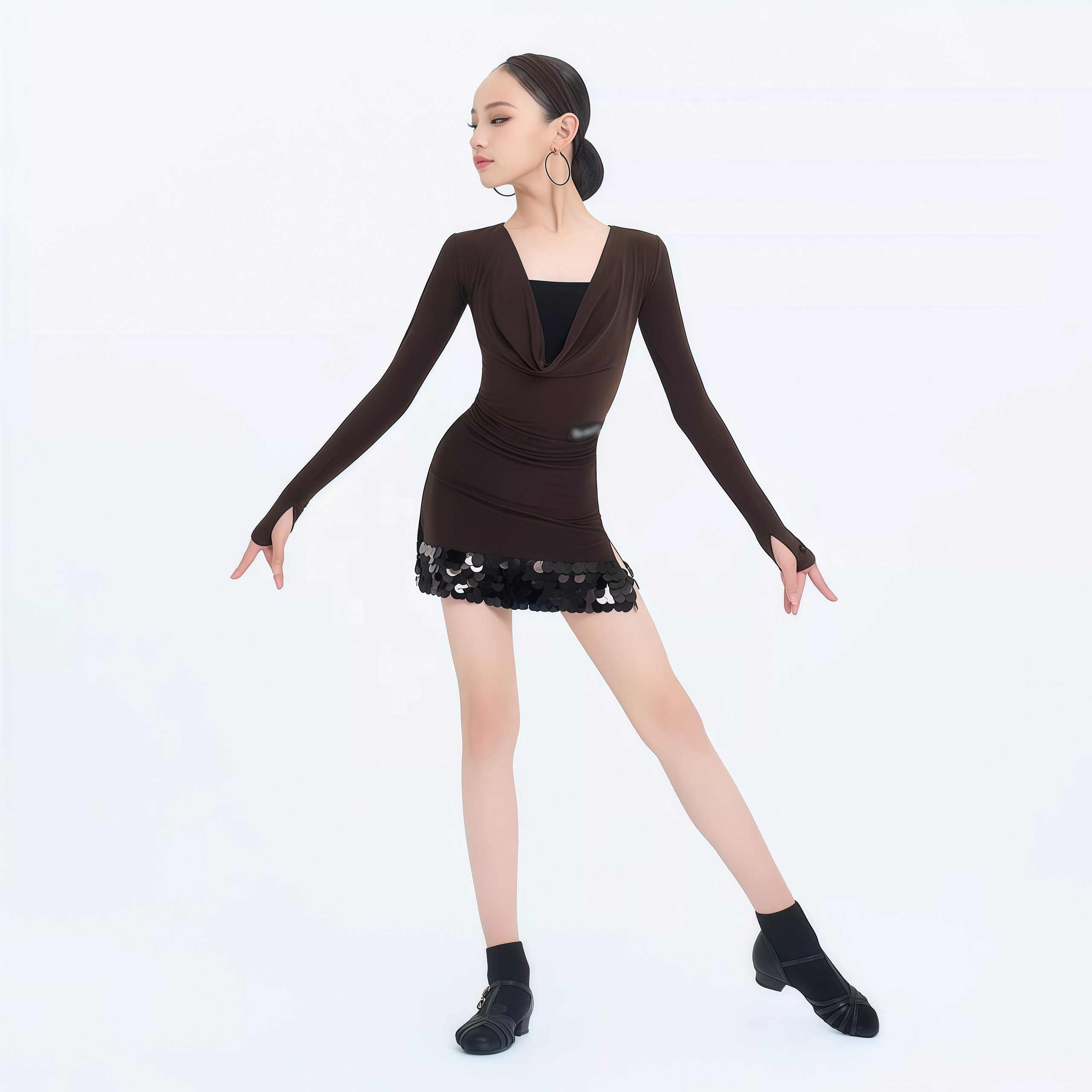 2026冬季新款拉丁舞服女童演出表演服高级感勾手长袖荡领连衣裙