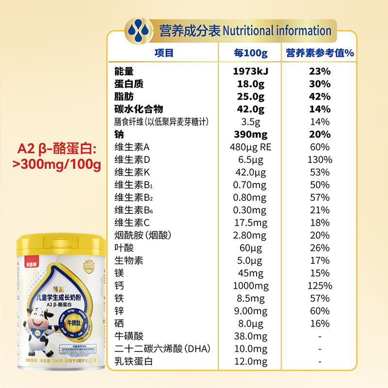 贝因美儿童成长学生奶粉A2β酪蛋白高钙赖氨酸青少年高个子700g