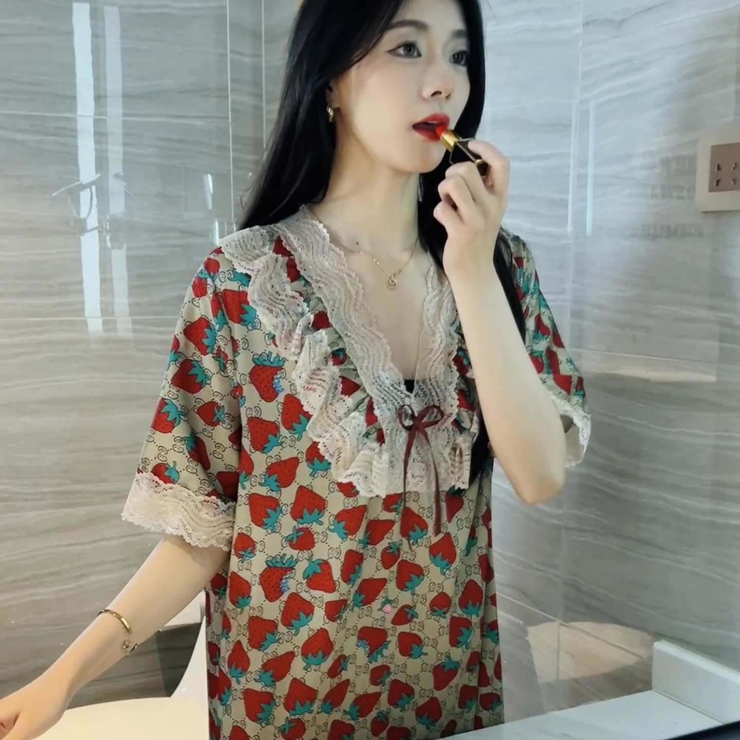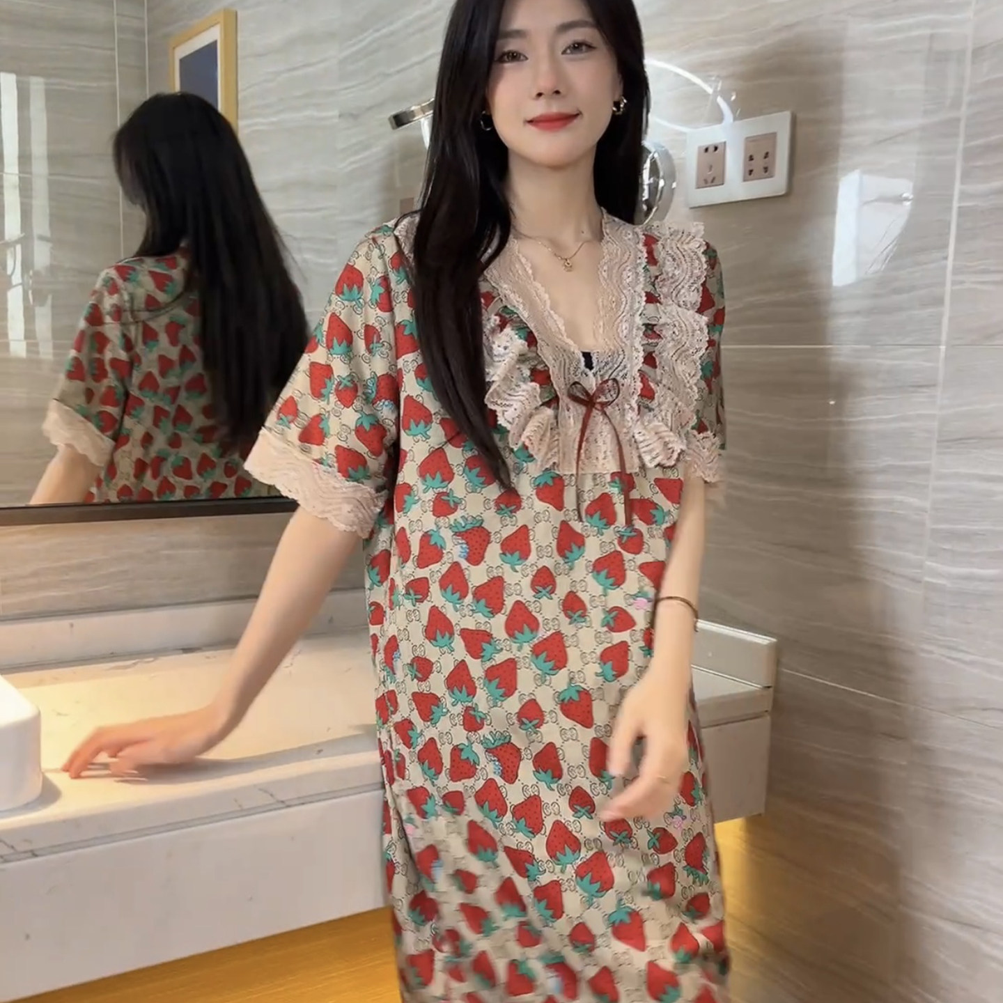 草莓冰雪丝睡裙女士夏季2026新款短袖蕾丝边妈妈连衣裙睡衣家居服