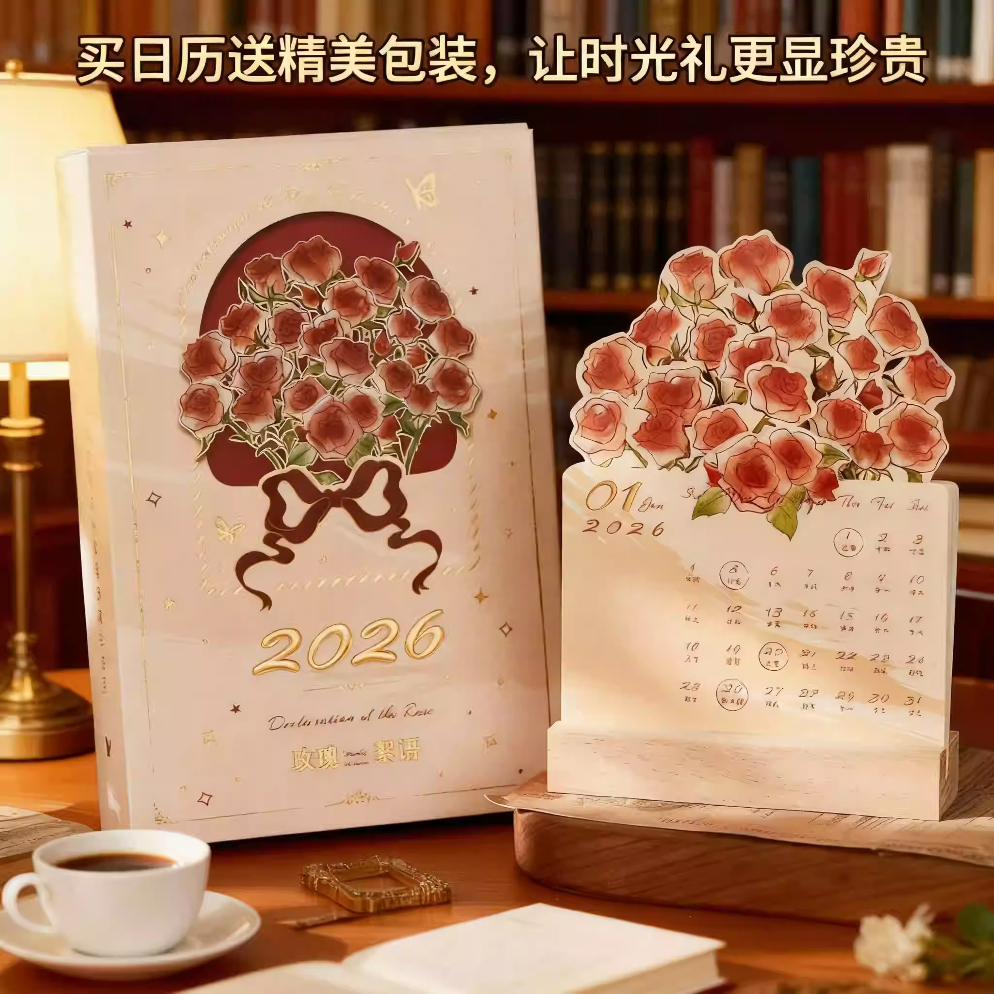 2026年玫瑰花台历可爱卡通ins风木质日历桌面摆件创意办公室礼品