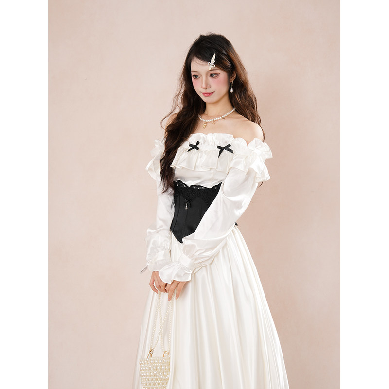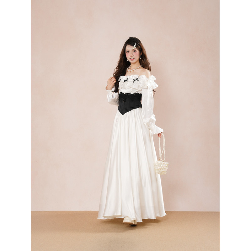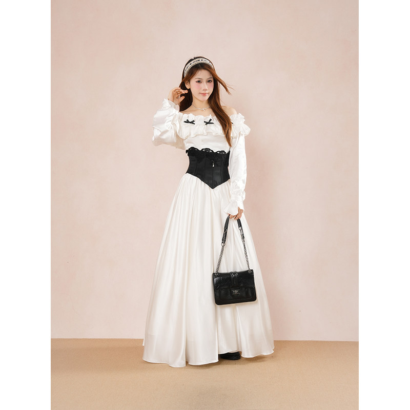 纯欲风一字肩气质蝴蝶结长袖连衣裙秋冬新款白色缎面收腰显瘦长裙
