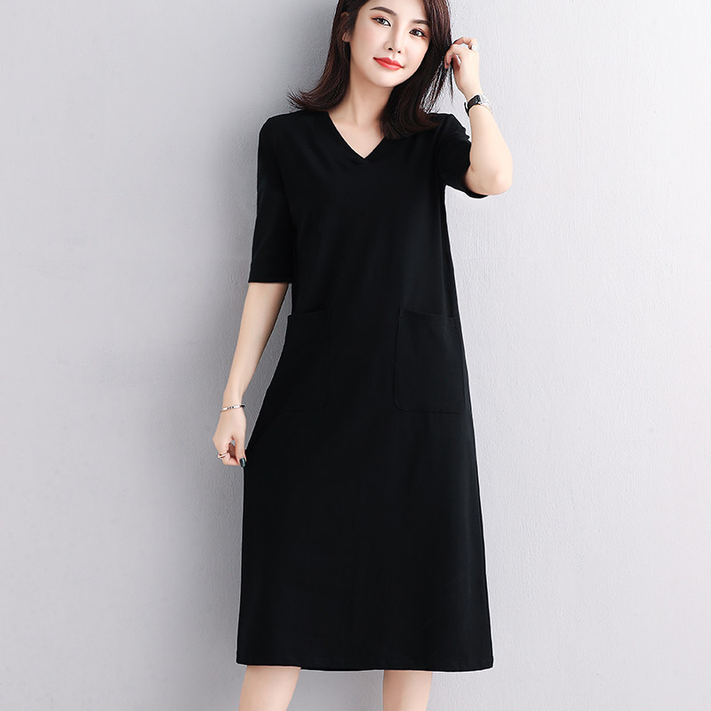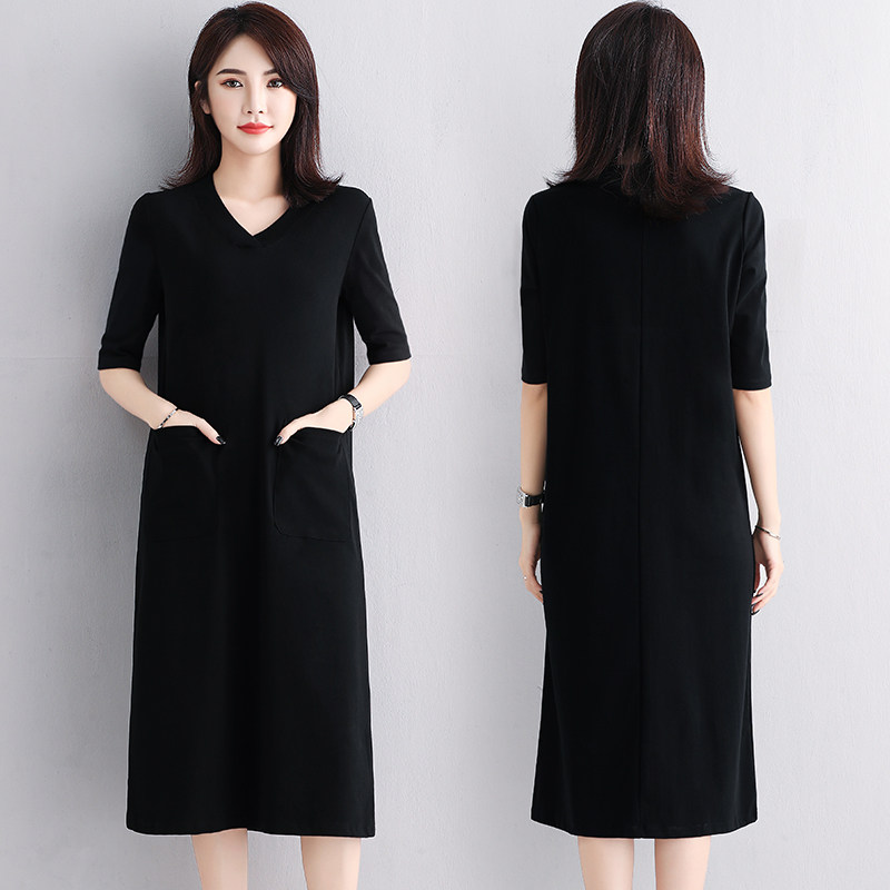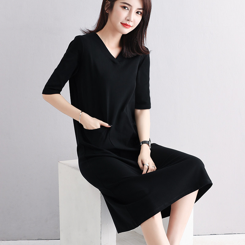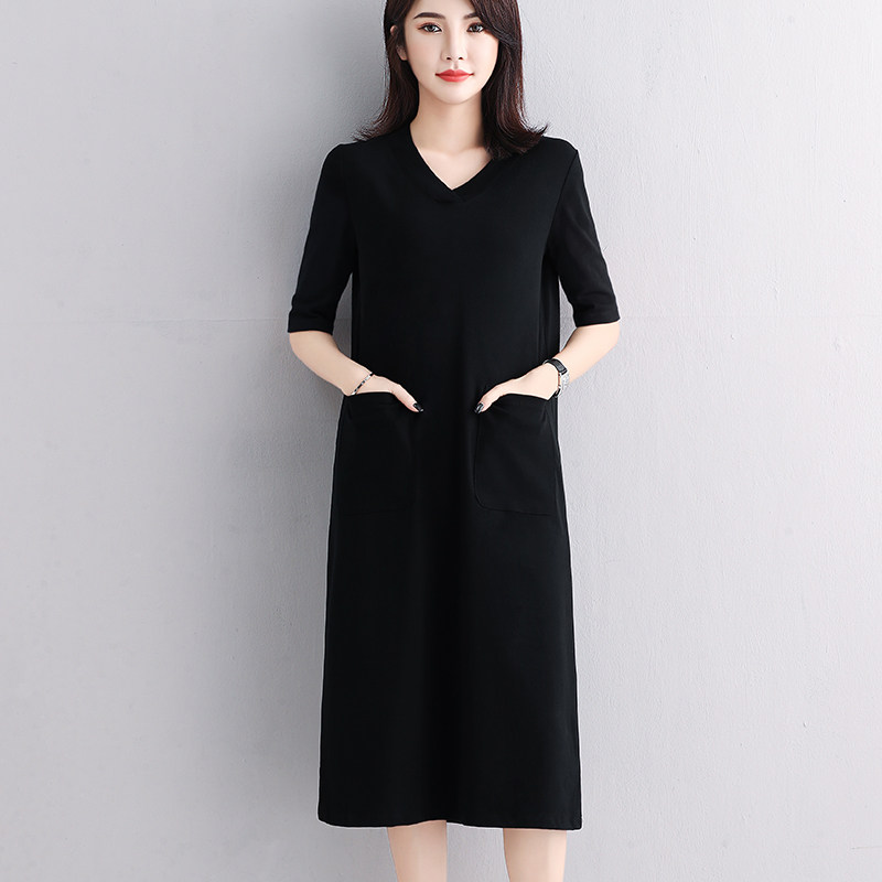黑色宽松V领中袖连衣裙女中长款春秋新款纯色大码五分袖打底长裙