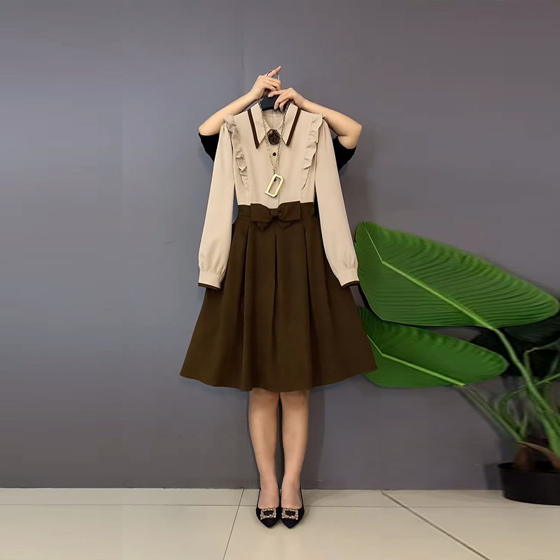 加大码女装翻领荷叶肩拼色裙摆收腰连衣裙胖妹妹秋冬款通勤风裙子