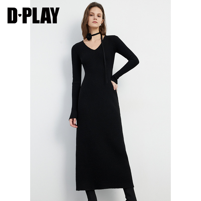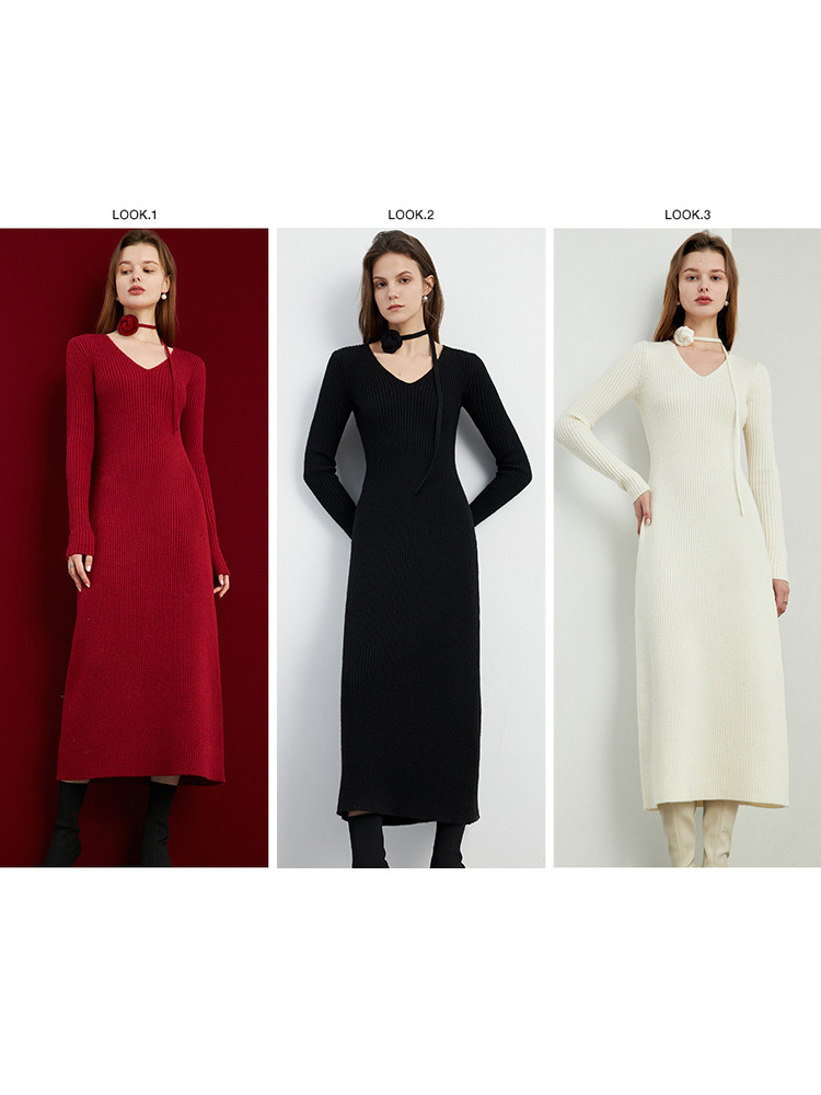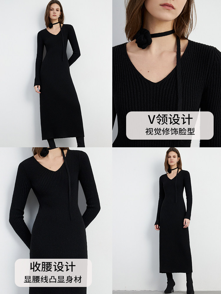 311线报网描述:山茶缪斯针织连衣裙,V领收腰长款大摆长袖