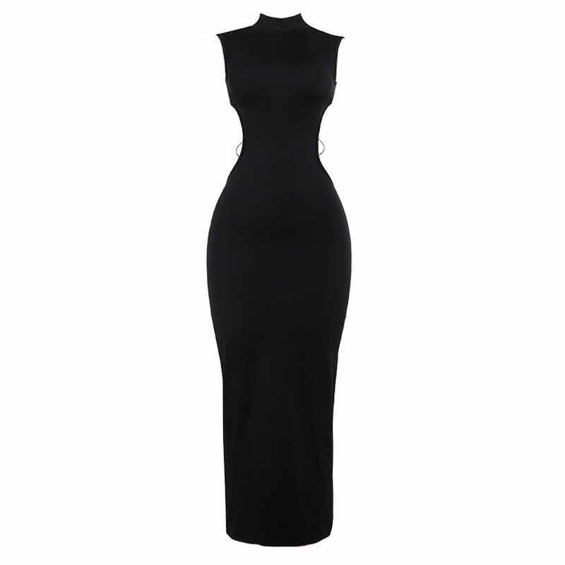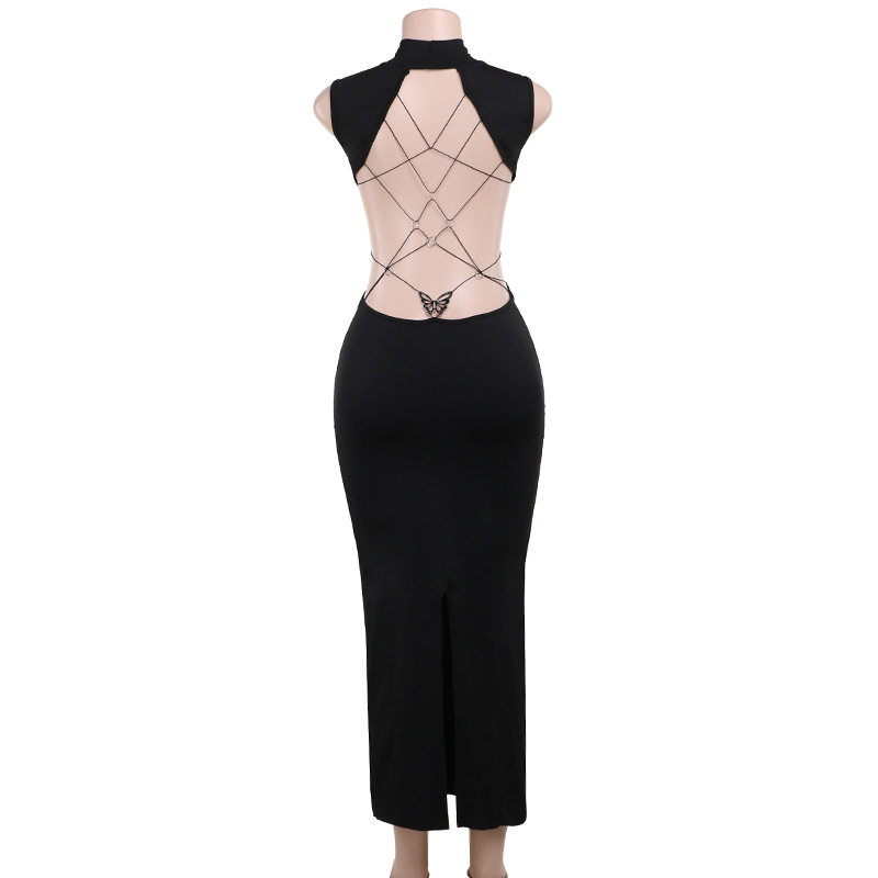 欧美风小众露背金属蝴蝶无袖连衣裙黑色半高领显瘦包臀后开叉长裙